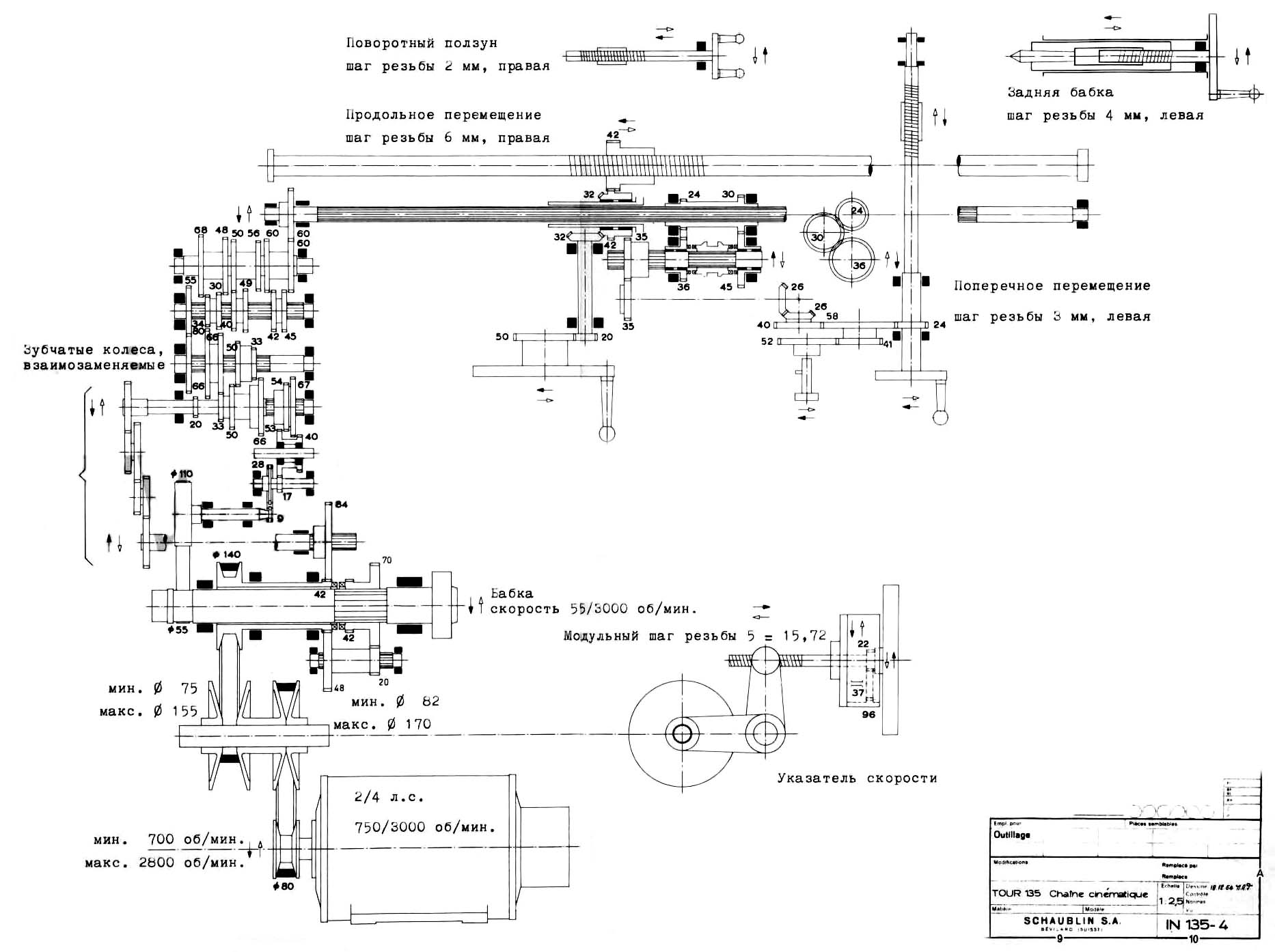 Схема кінематична токарно-гвинторізного верстата Schaublin 135. Дивитись у збільшеному масштабі