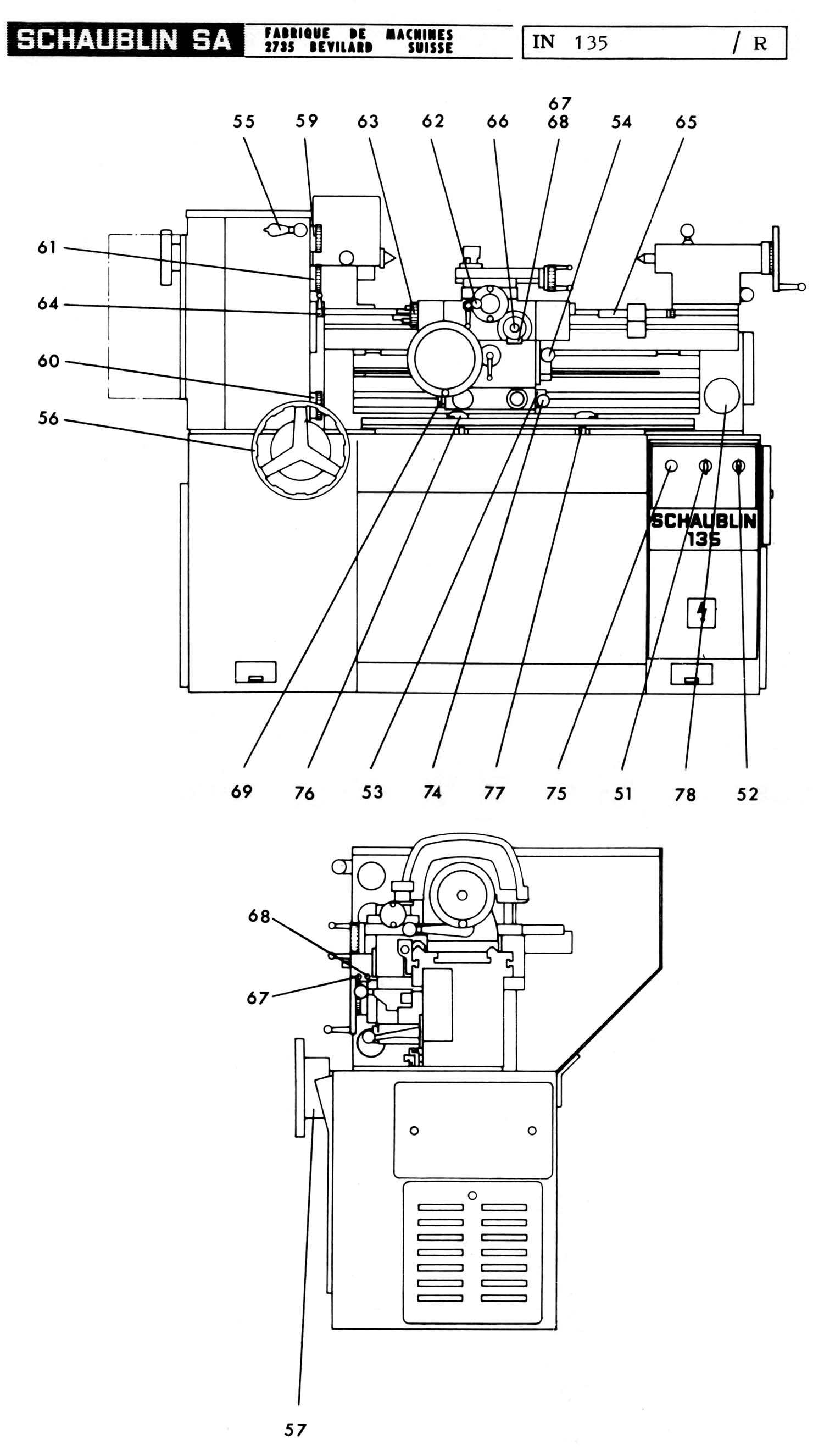 Керуючий важіль редуктора 55 дозволяє переходити з діапазонів а) та с) на діапазони b) та d). Пластина з червоним знаком (включати тільки при зупинці) нагадує, що шпиндель бабки повинен бути у стані спокою, коли пересувається цей важіль.