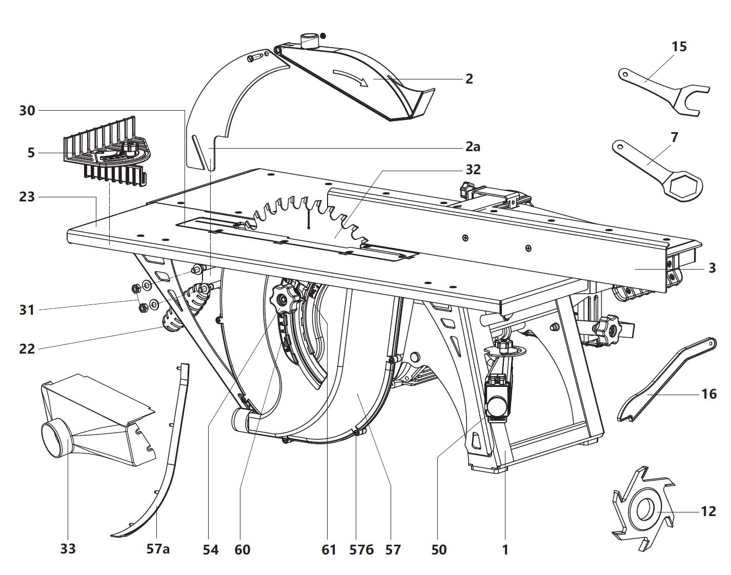 1. кожух диска пильного; 57а – вкладыш для фрезерування; 57б – винты крепления передньої частини кожуха пильного диска