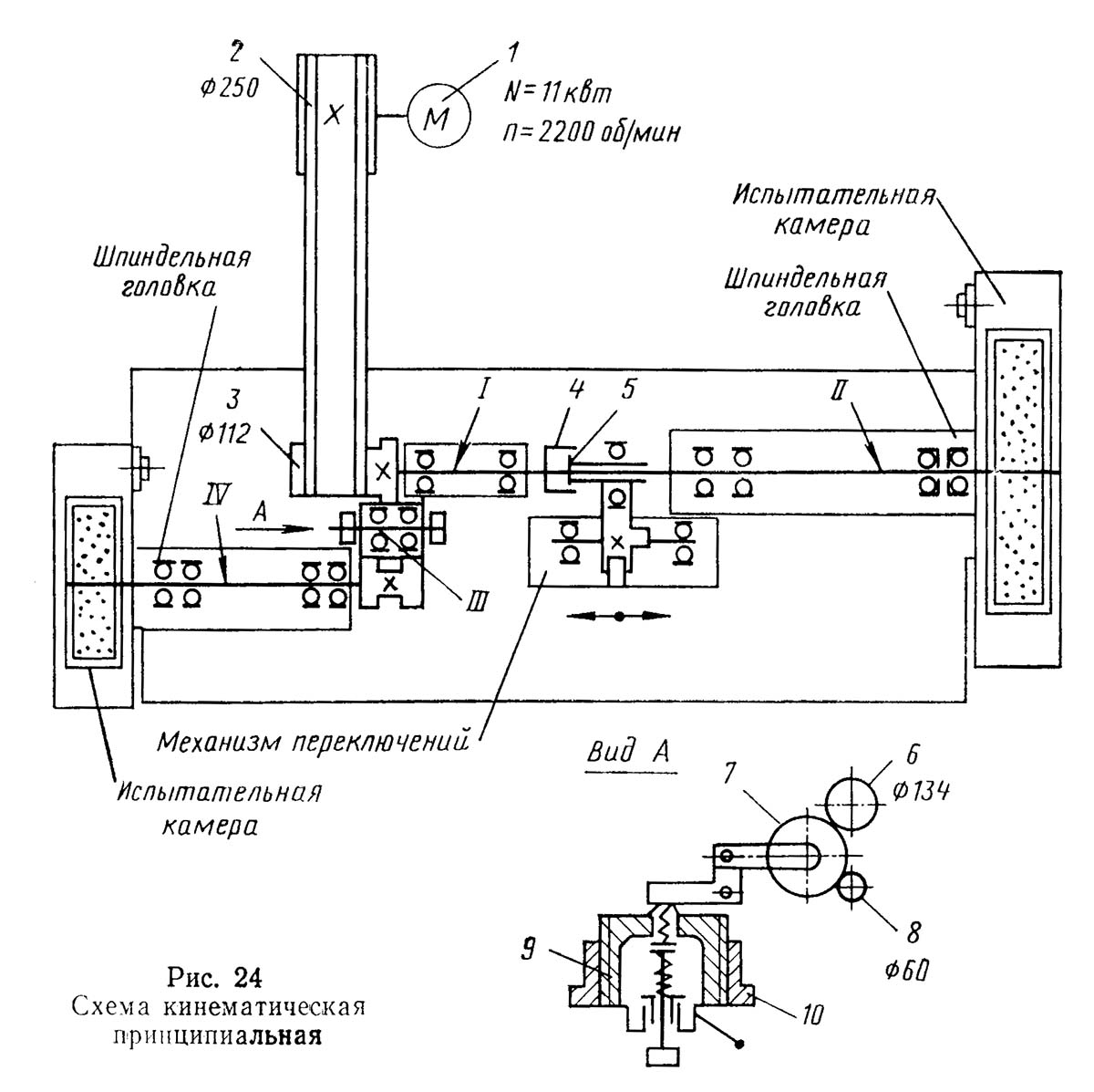 Обертання шпинделів роздільне. Шпиндель великої камери включається за допомогою зубчастої муфти 4; 5. Шпиндель малої камери – за допомогою фрикційного ролика 7.