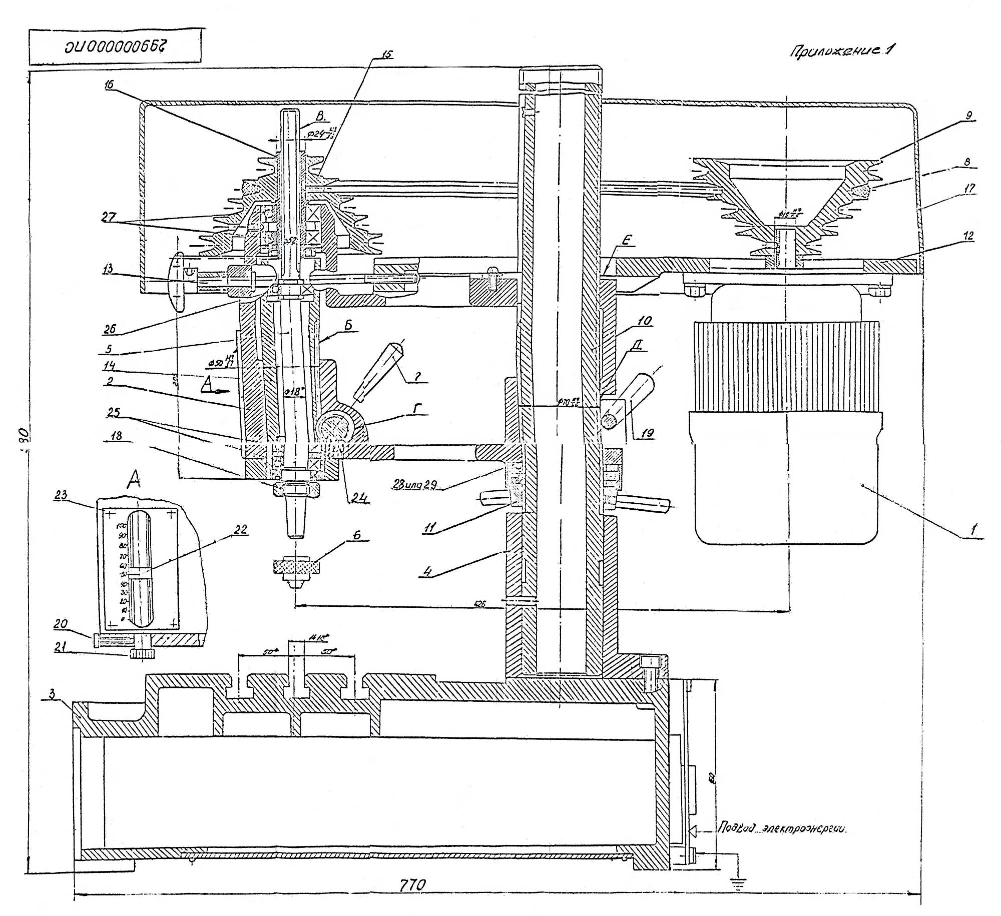 Обертання від електродвигуна передається через ремінну передачу 1, 3-ступінчасту коробку швидкостей і 2-ступінчастиний шків на вал шпинделя.