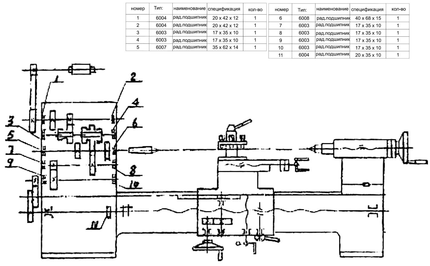 Схема розташування підшипників кочення верстата токарного SPA-500. Дивитись у збільшеному масштабі