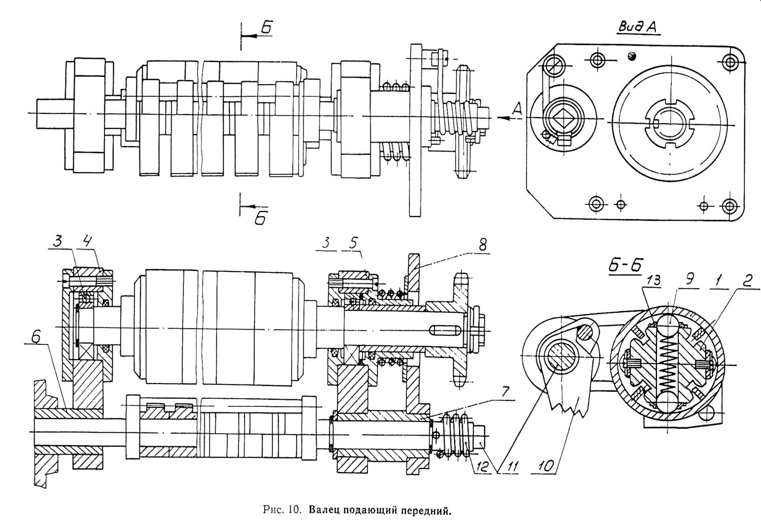 Секции 1 (рис. 10) переднего подающего вальца монтируются на валу 2. Вал 2 вращается на шарикопідшипниках 3, установленных в кронштейнах 4 і 5. Кронштейн 4 качается на промежуточной втулке 6, установленной в блоке верстата, кронштейн 5 — на втулке 7, смонтированной в щеке 8. На валу 2 имеются продольные прорези — канавки, в которых размещаются упорные планки секционных колец 1.