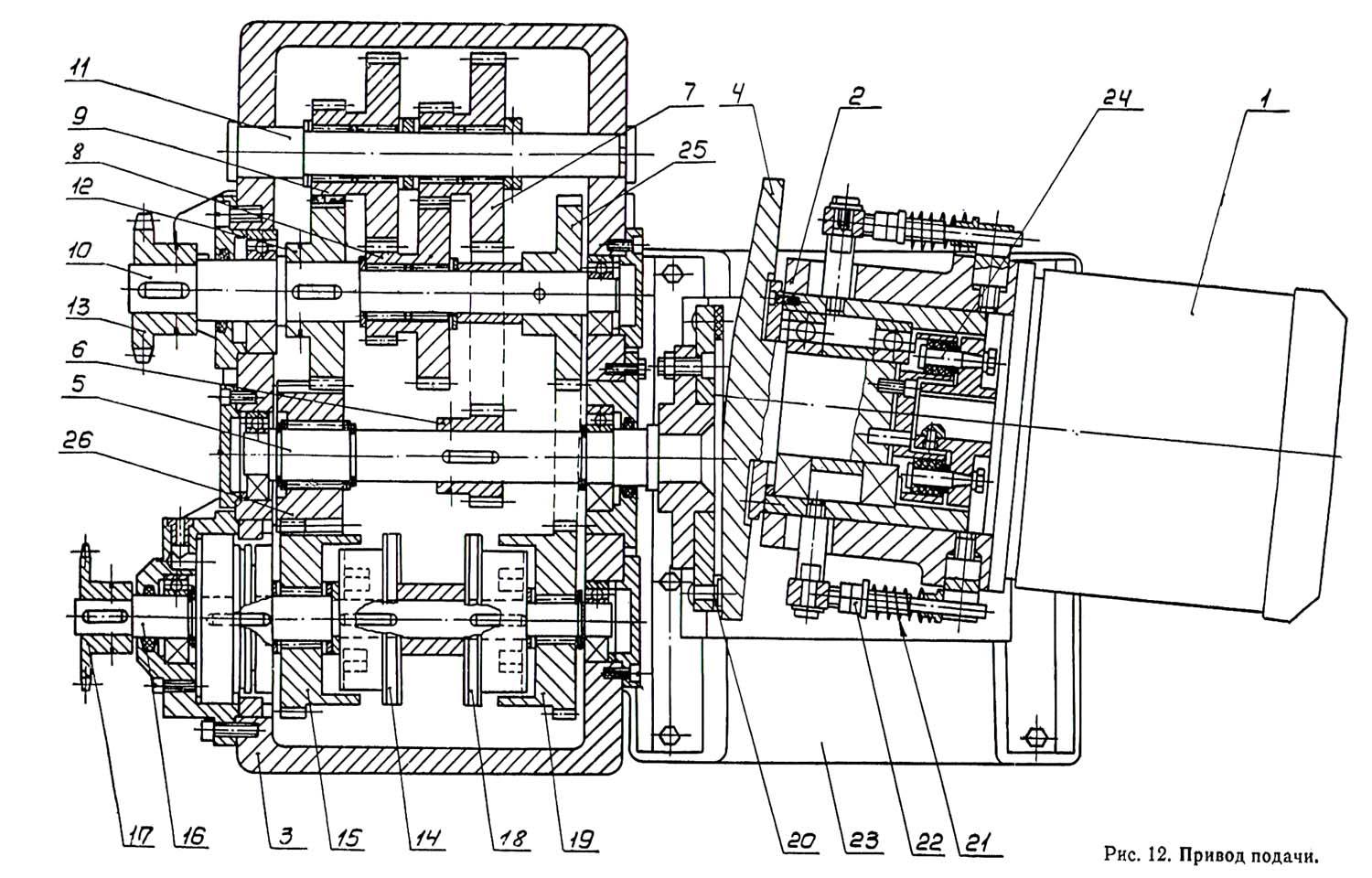 Бесступенчатый привід подачі состоит из електродвигуна 1, механического варіатора 2, редуктора 3, смонтированных на одной плите 23.