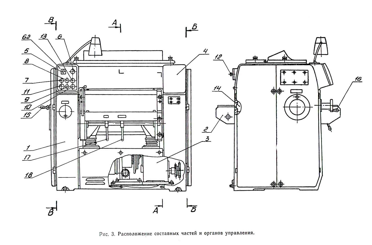 Розташування складових частин і органів керування рейсмусовым верстатом СР-6-9