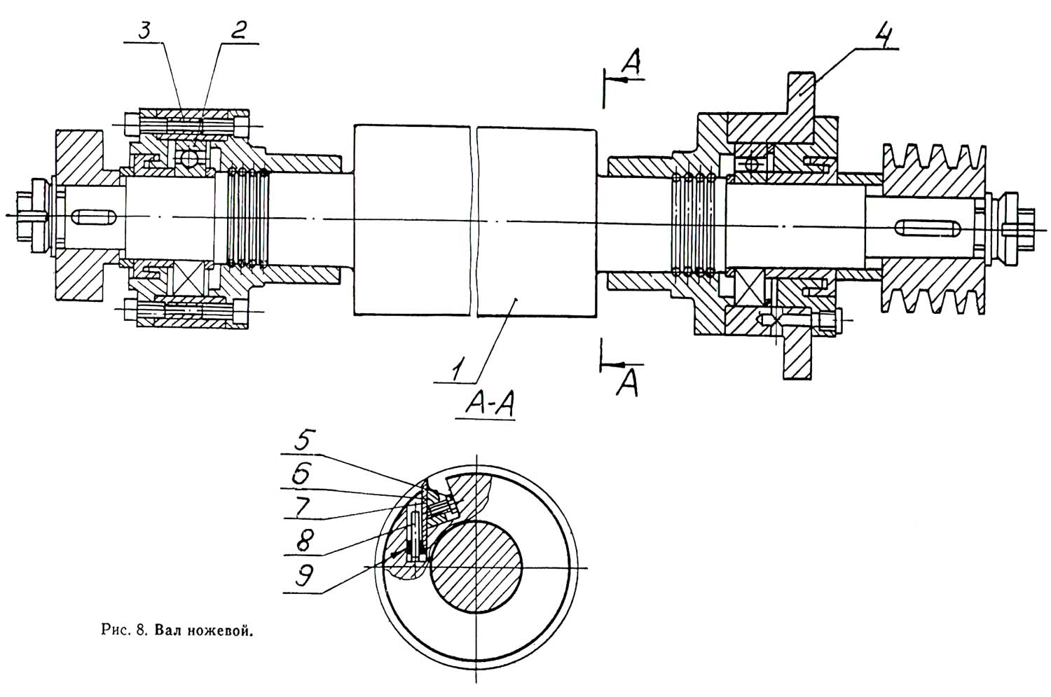 Корпус ножевого вала 1 цилиндрической формы имеет четыре паза, размещенные параллельно оси вала, в которые устанавливаются прямые ножи - 7. Крепление ножей производится клиньями 6 і гвинтами 5. Выставка ножей осуществляется гвинтами 8 через гайки 9. Корпус ножевого вала монтируется на шарикопідшипниках 2, размещенных в цилиндрических опорах 3 і 4. На станке ножевой вал устанавливается в расточках блока 4 (см. рис. 3). Вращение ножевого вала осуществляется от електродвигуна 47 (см. рис. 5) клиноременной передачей 46. Електродвигун установлен на качающейся плите 49.