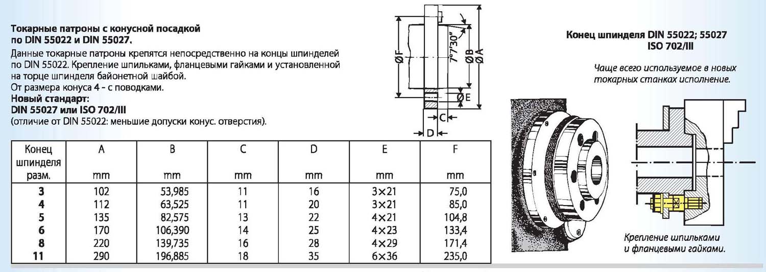3. Фланцевый конец шпинделя - з конусной посадкой. Фланец шпинделя имеет отверстия для непосредственного крепления патрона з помощью поворотной (байонетной) шайбы - ето наиболее распространенный і предпочтительный вигляд крепления;