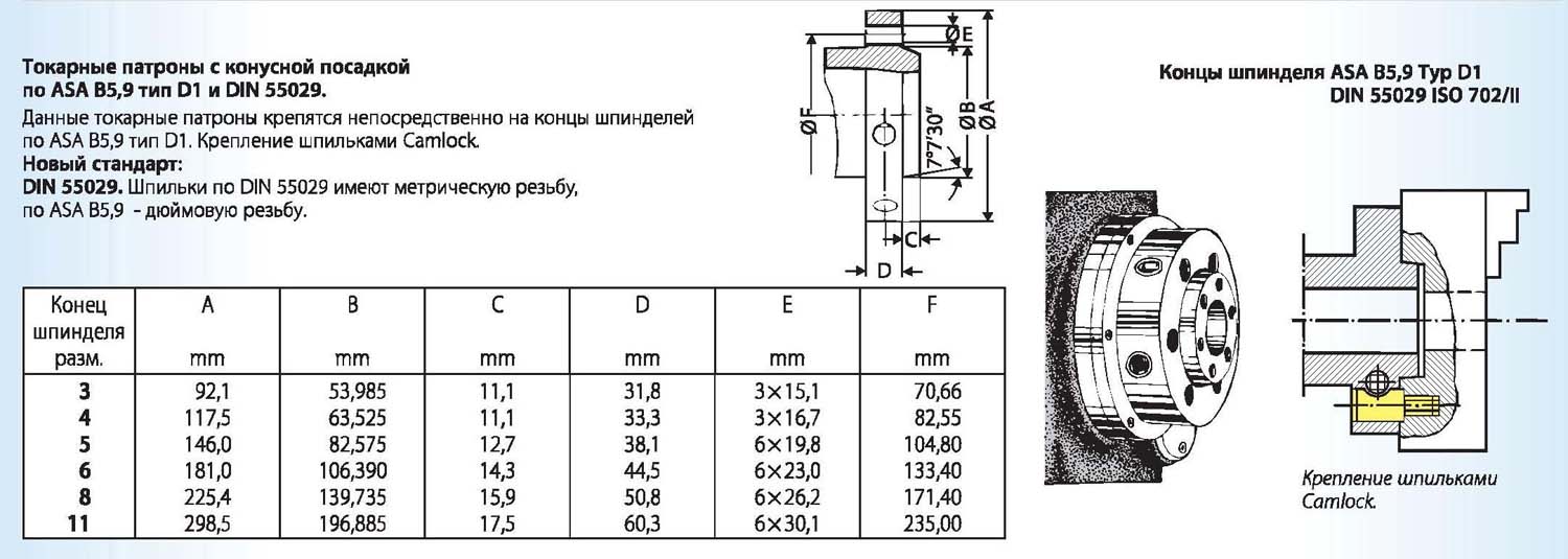 4. Фланцевый конец шпинделя - з конусной посадкой. Фланец шпинделя имеет отверстия для непосредственного крепления патрона з помощью шпилек типа Camlock