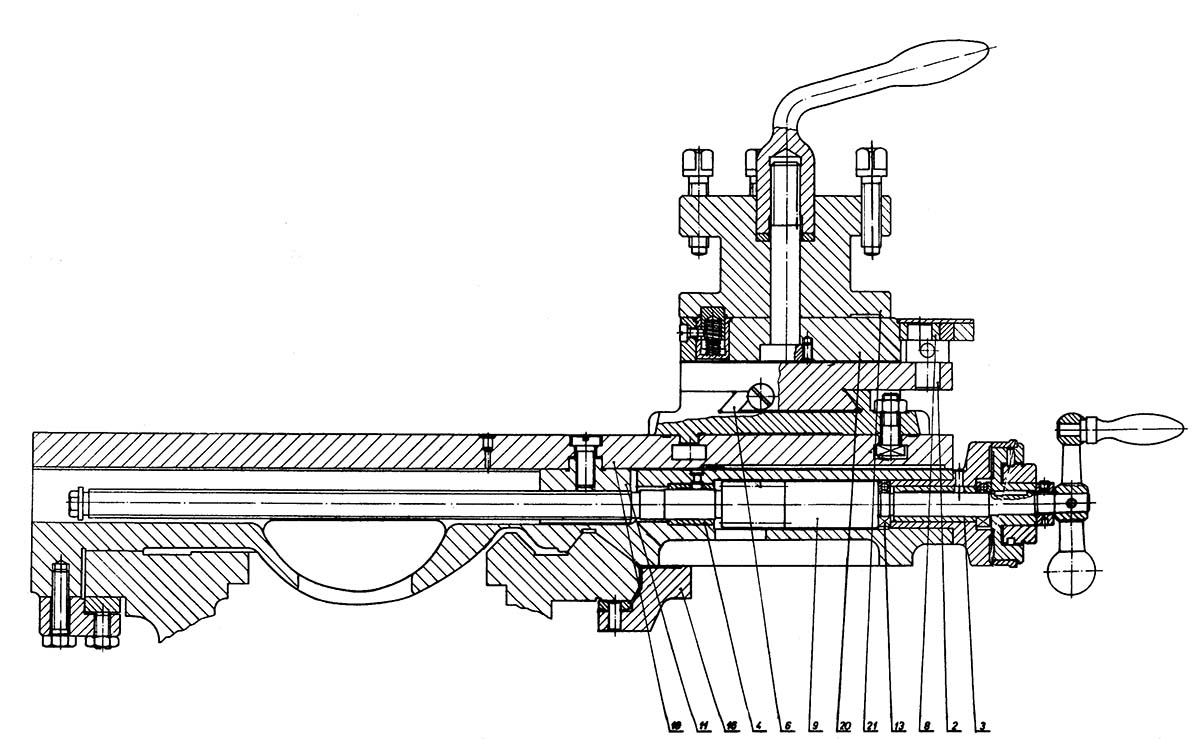 Для швидкого відведення супорта при нарізанні різьблення, поздовжній супорт оснащений спеціальним поперечним супортом, швидке відведення якого при нарізуванні різьблення проводиться ексцентриком, керованим рукояткою 14 (рис. 4), і який відсуває різець на 10 мм від виробу»
