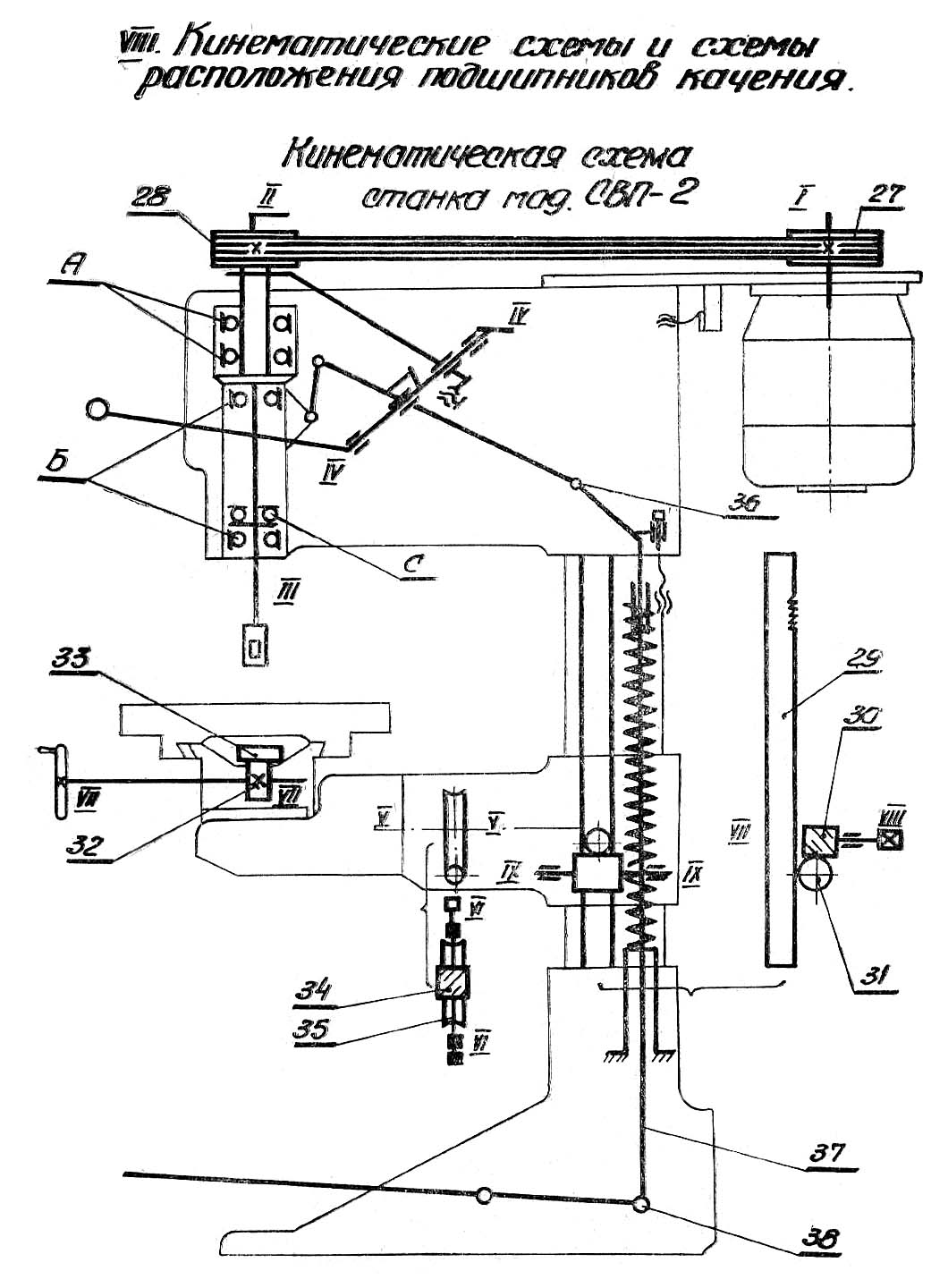 Схема кінематична сверлильно-пазовального верстата СВП-2. Дивитись у збільшеному масштабі