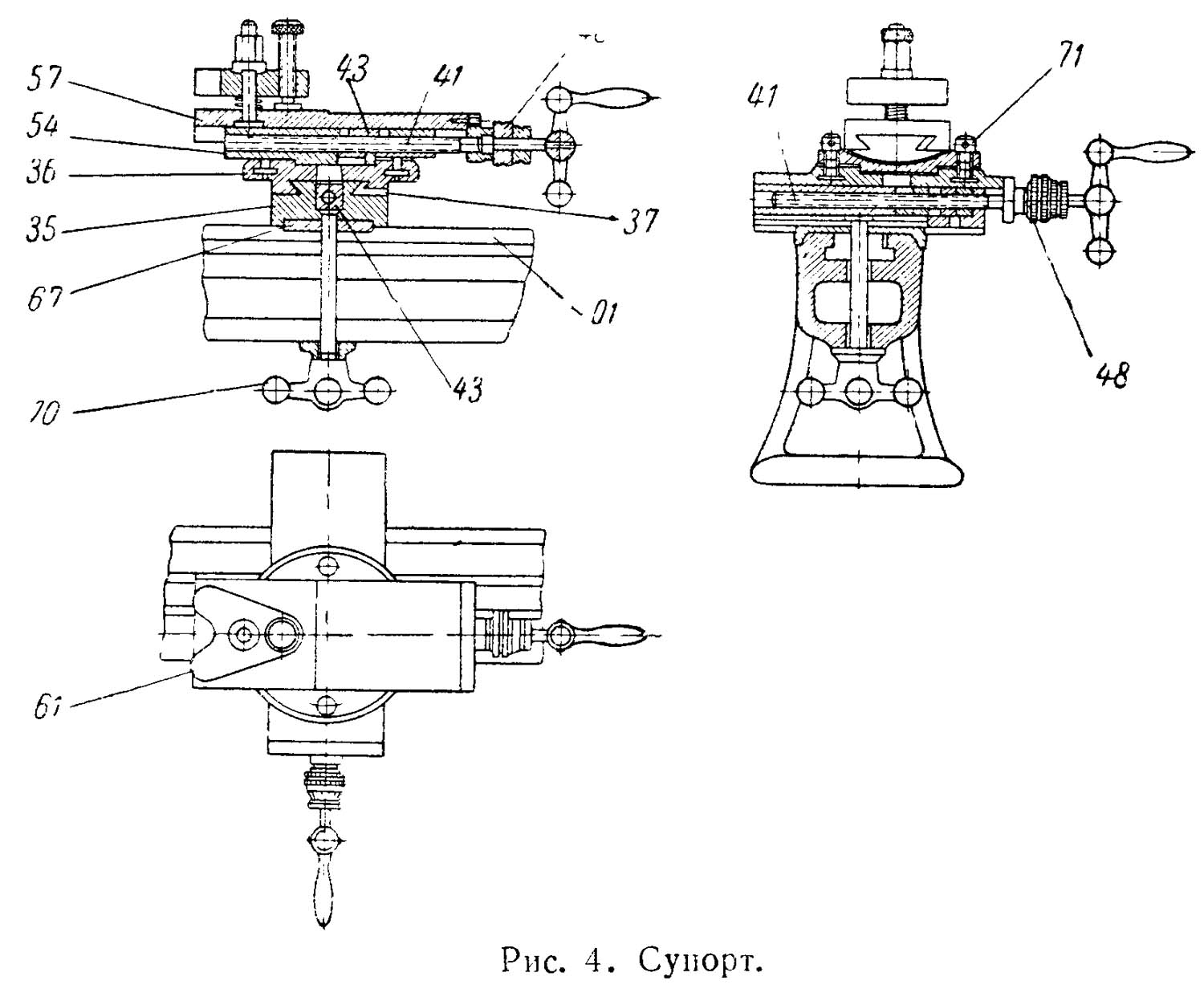 Поперечний суппорт несе на собі поздовжній суппорт 54 і 57, що встановлюється під будь-яким кутом по градуйованому диску поперечного супорта 36. Для встановлення поздовжнього супорта під потрібний кут потрібно звільнити гвинти 71, повернути супорт на необхідний кут і знову затягнути гвинти 1. за допомогою гвинтів 41, з градуйованими лімбами з ціною поділу 0,05 мм. Верхня частинина поздовжнього супорта забезпечена тримачом 61 для кріплення різця. Мертвий хід гвинтів вибирається за допомогою підгортання затискної гайки 48. Регулюється хід санок супортів за допомогою клина 37 і чотирьох гвинтів підгортанням до плавного ходу санок. Закріплюється суппорт на станині в необхідному положенні гайкою 70, при цьому ретельно протирається основа 67 і станина від бруду та стружок.