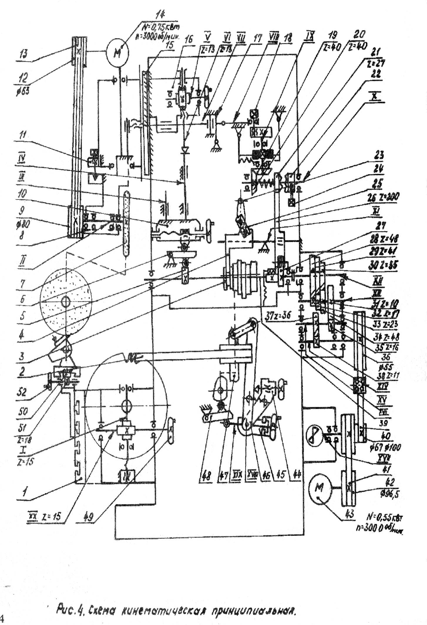 Вращение от електродвигуна 43 передається з помощью клиноременной передачи 41, включающей в себя двухступенчатый шкив 40 і 42, на вал XVII вентилятора. С вала XVII вращение передається з помощью второй клиноременной передачи 39 і шкива 36 на вал XIV трехступінчастого трехскоростного редуктора. С вала XIV через валы XV і XIII на вал XII вращение передається з помощью шестерен 38, 37, 35, 34, 31, 32, 33, 29 і 30. С вала XII редуктора вращение передається на распределительный вал XVI. Вертикальное возвратно-поступательное рух шлифовальной головки происходит от кулачка 5, закрепленного на распределительном валу XVI через рычаг б з роликом, колодку 10 з регулируемым роликом, штангой IV і направляющей III. Штанга IV воздействует на винт-шестерню VI, которая установлена в корпусе 16 механізма подачі. Корпус 16 прикреплен к ползуну 15, к которому, в свою очередь, прикреплена шлифовальная головка 8.