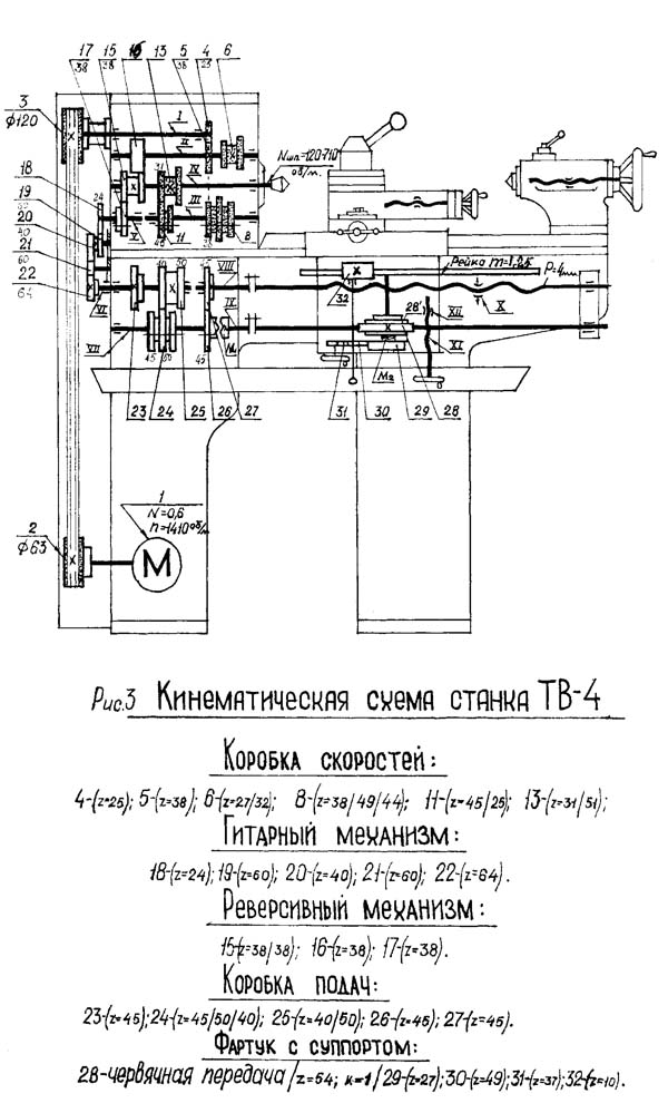 3. Кінематична схема токарно-гвинторізного верстата ТВ-4. Дивитись у збільшеному масштабі