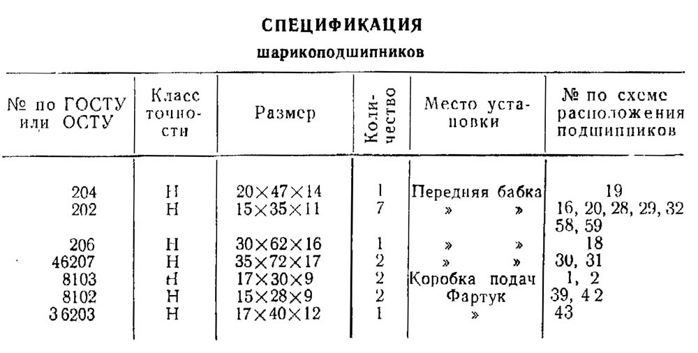 Специфікація підшибників токарного верстата тв-4