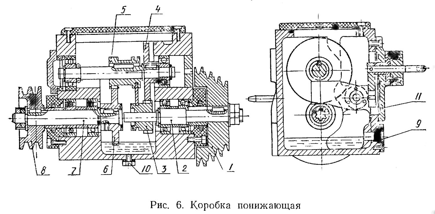 При переміщенні шестерні 9 вправо, вона вийде із зачеплення з шестернею 10 і увійде в зачеплення з муфтою 11, яка передає обертання на вал 7.