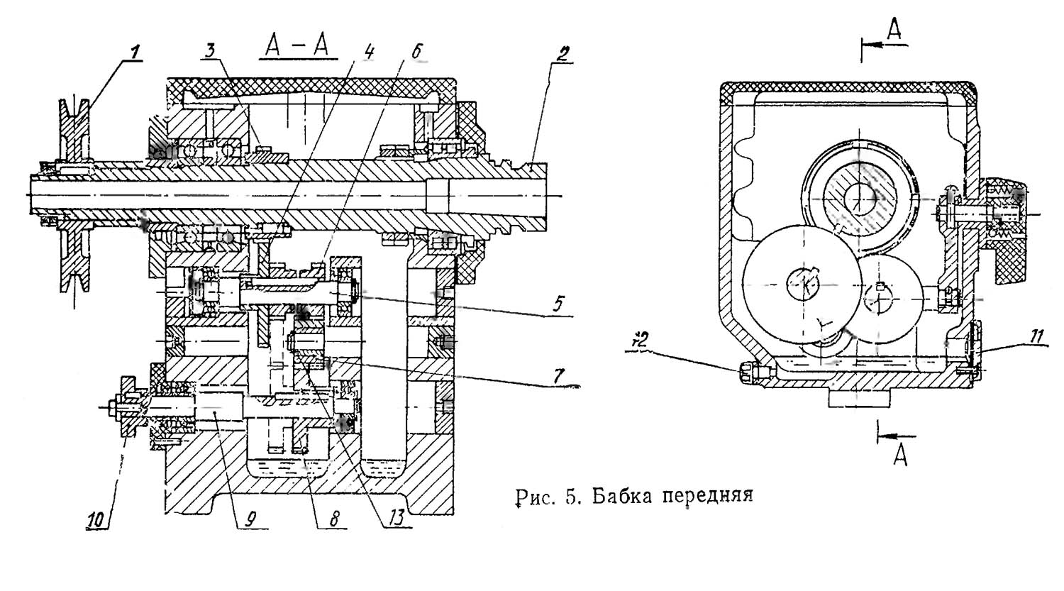 На лицьовій стороні корпусу передньої бабки розташований масловказівник 11. На звороті є пробка 12 для зливу масла