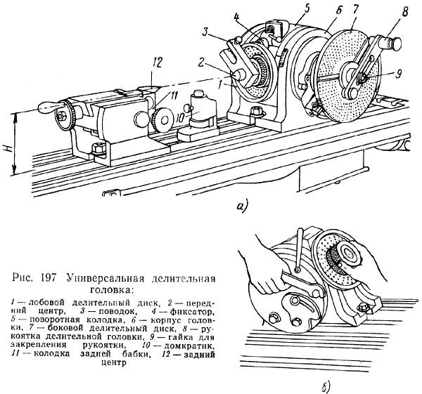 Ділильна бабка состоит из нерухомого основания 7, в котором помещены корпус 5 і полый шпиндель 13. Корпус 5 со шпинделем і двумя боковыми фланцами 4 і 6 поворачивается вокруг горизонтальной оси на 90° вверх і на 10° вниз. Отсчет производится по градуировке, нанесенной на поверхности корпуса, і нониусу 22, прикрепленному к нерухомою дуге. Крепление корпуса в требуемом положении производится затягиванием фланцев двумя гайками з помощью стяжных болтов.