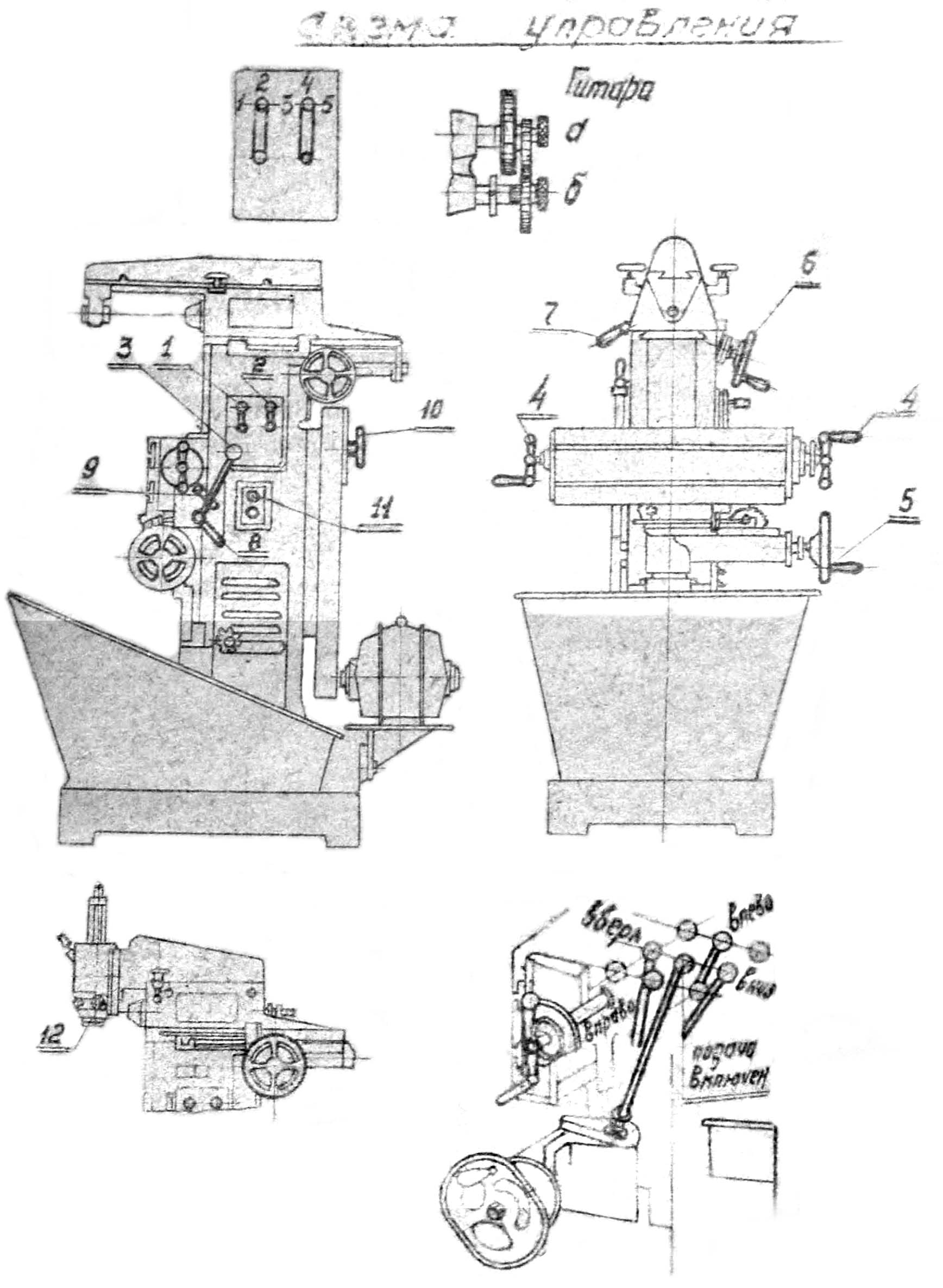 Розташування органів керування фрезерным верстатом УФ-600с. Увеличенный чертеж