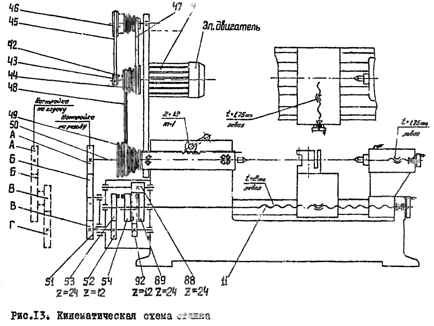 Від змінного зубчастого колеса А (див. рис. 13), встановленого на шпиндель 50, обертання передається через змінні зубчасті колеса Б, В, Г (при налаштуванні на подачу) або Б, (при налаштуванні на нарізування різьби) на вал 51, зубчасті колеса 52, 53 або зубчасті колеса 92, 88 і 89, муфту 54 включення механічного поздовжнього переміщення супорта ліворуч або праворуч і вимкнення його, і далі на поздовжній ходовий гвинт 11.