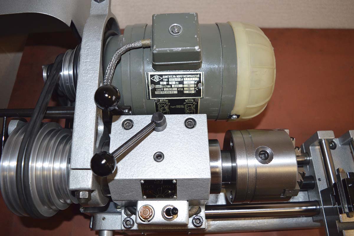 Шпиндель отримує 11 швидкостей обертання електромотора потужністю 250 Вт через шківний привід. 4-і швидкості виходять перестановкою шківних ременів між 4-х ступінчастиними шківами електродвигуна та приймальним шківом шпинделя. Інші швидкості досягаються застосуванням додаткового (проміжного) шківа.