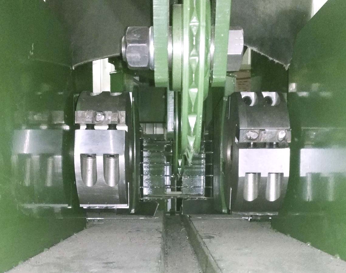 Полученный двухкантный брус (лафет) подаётся в многопильный узел двухвального типа.