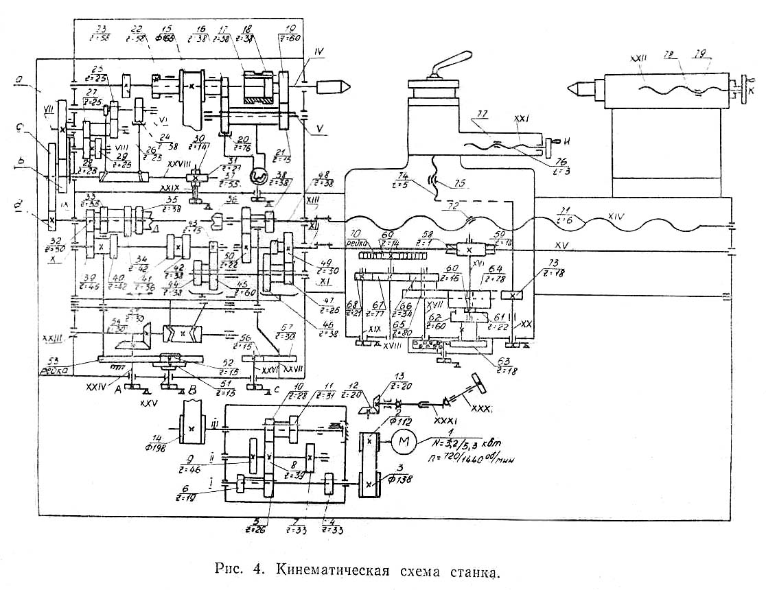 Схема кінематична токарно-гвинторізного верстата УТ16В. Скачать в увеличенном масштабе