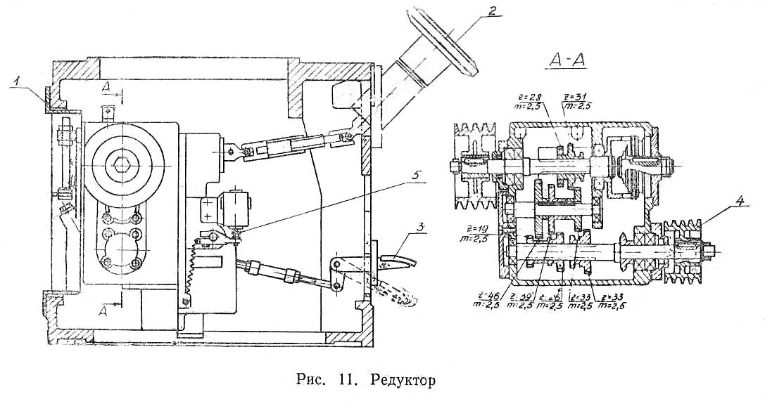 Редуктор (рис. 11), що має шість ступенів частоти обертання, кріпиться до рами 1, закріпленої на задній стінці тумби.