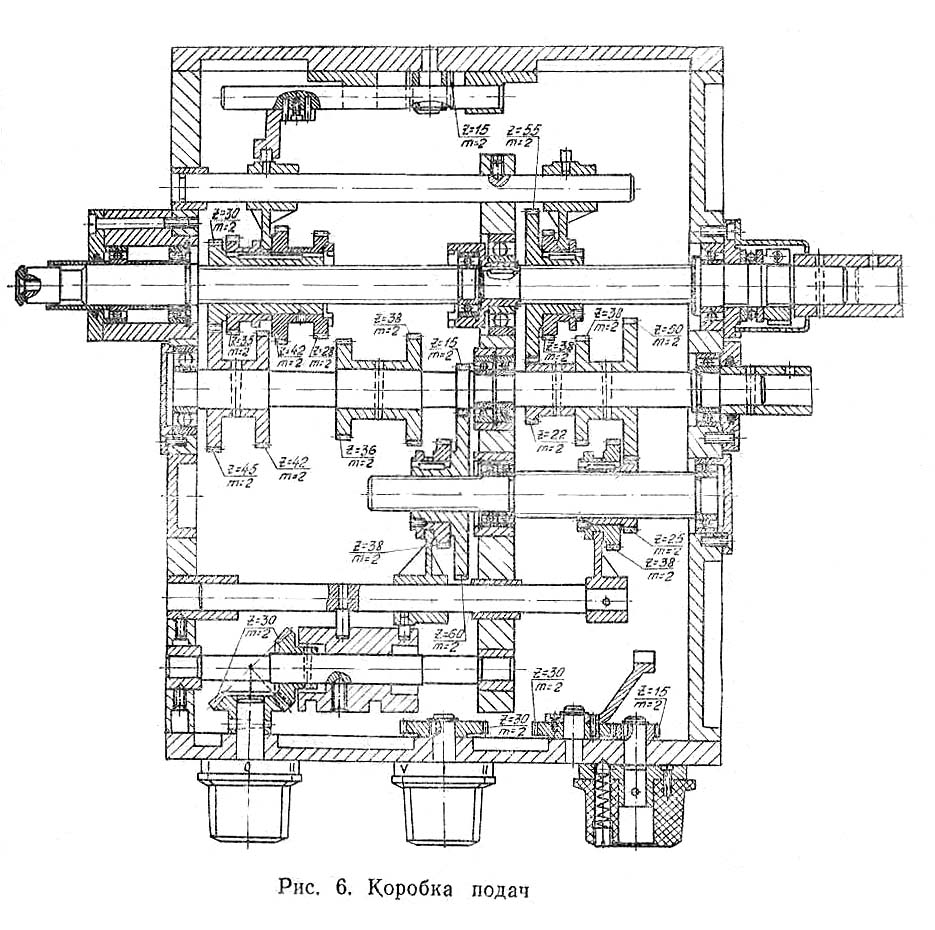 Коробка подач отримує рух від вихідного валу шпиндельної бабки через змінні зубчасті колеса.