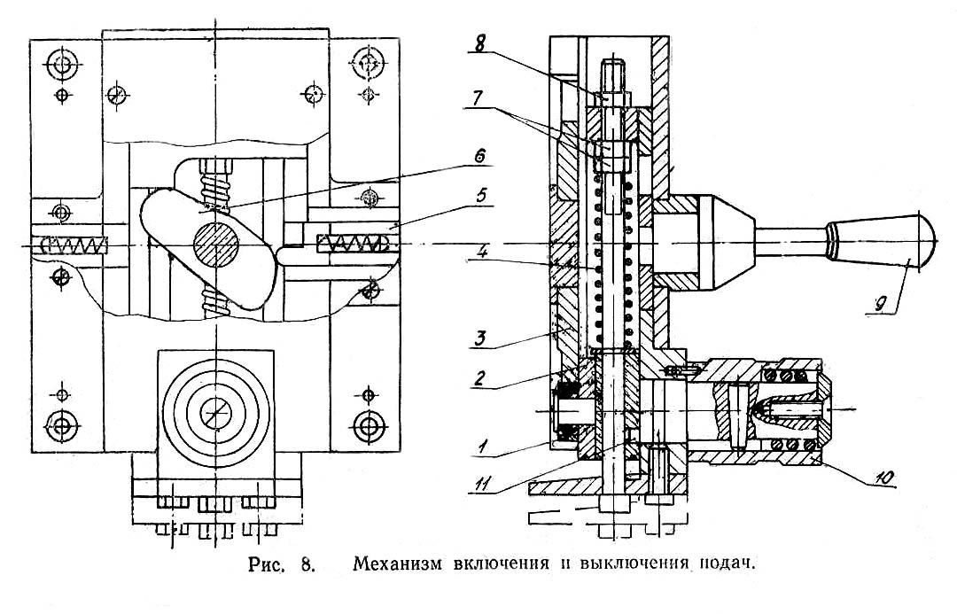 Регулювання величини вимикаючого зусилля під час роботи з жорстких упорів здійснюється за допомогою спеціальної рукоятки фартуха 10, пов'язаної з ексцентриковим пальцем 11. Попередня настройка пружини (при складанні та ремонтах) здійснюється за допомогою гайок 7, 8.
