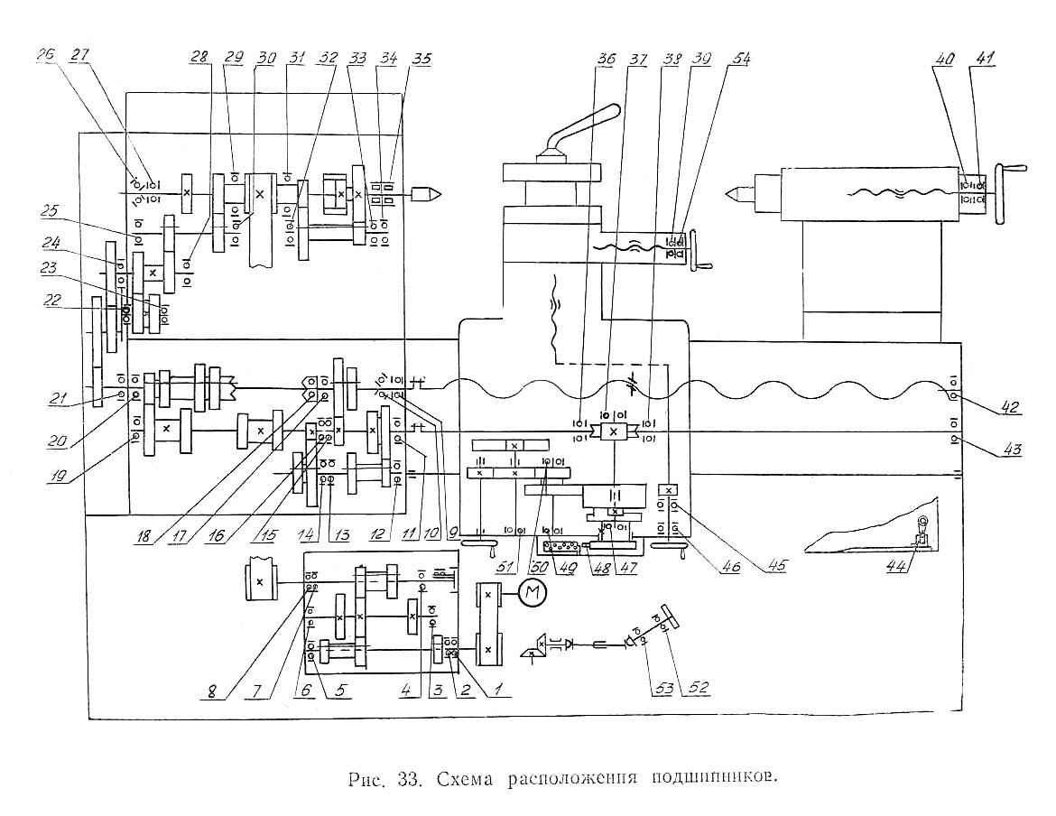 Схема розположення підшибників токарно-гвинторізного верстата УТ16В. Скачать в увеличенном масштабе