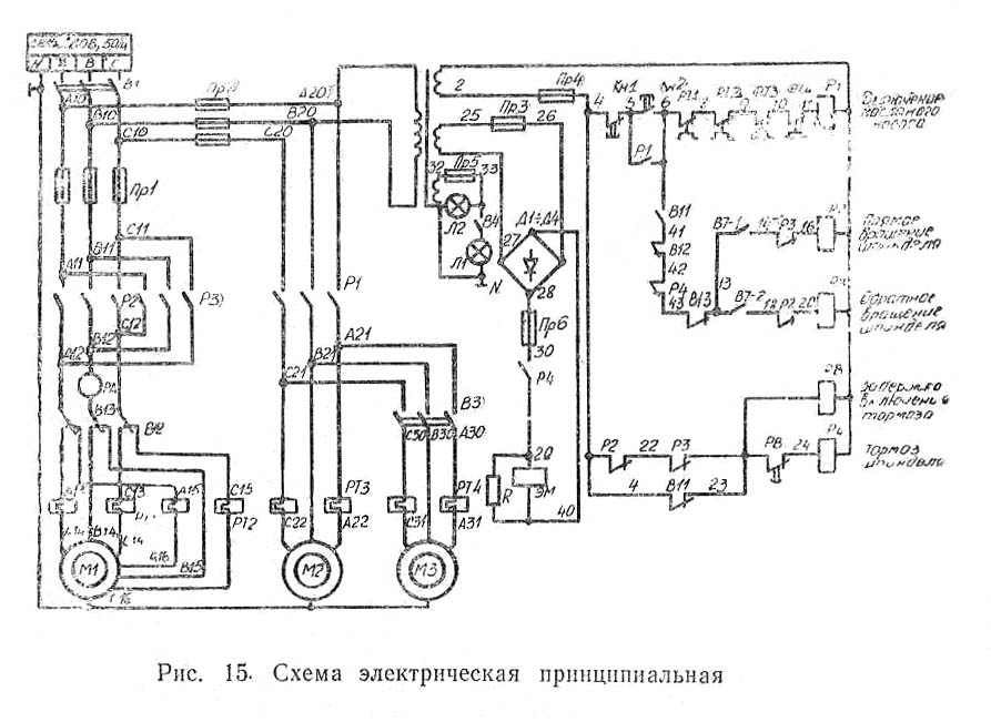 Увімкнення станка здійснюється пакетним вимикачем В1, потім кнопкою Кн2 через магнітний пускач Р1 включається електродвигун системи змащення М2. Рукоятками керування рис. 3 поз 25, 39 пов'язаними з пакетним перемикачем В7, здійснюється увімкнення електродвигуна головного приводу Ml через реверсивний магнітний пускач Р2 (пряме обертання) або РЗ (зворотне обертання). Гальмування електродвигуна головного приводу Ml здійснюється електромагнітною муфтою ЕМ, на яку подається постійний струм з діодного моста Д1-Д4 через пускач Р4. Пускач Р4 включається після встановлення рукоятки управління обертання шпинделя в нейтральне положення через замикаючі контакти Р2, Р3 і РВ, при цьому включається реле годинника РВ, яке через встановлену витримку години відключає своїм контактом пускач Р4, останній відключає електромагнітну муфту ЕМ. Кінцевий вимикач В11 служить для комутації ланцюгів живлення Р2, Р3, Р4 у момент перемикання частоти обертання шпинделя. Спрацьовування В11 відбувається за натискання педалі рис. 3 поз. 29.