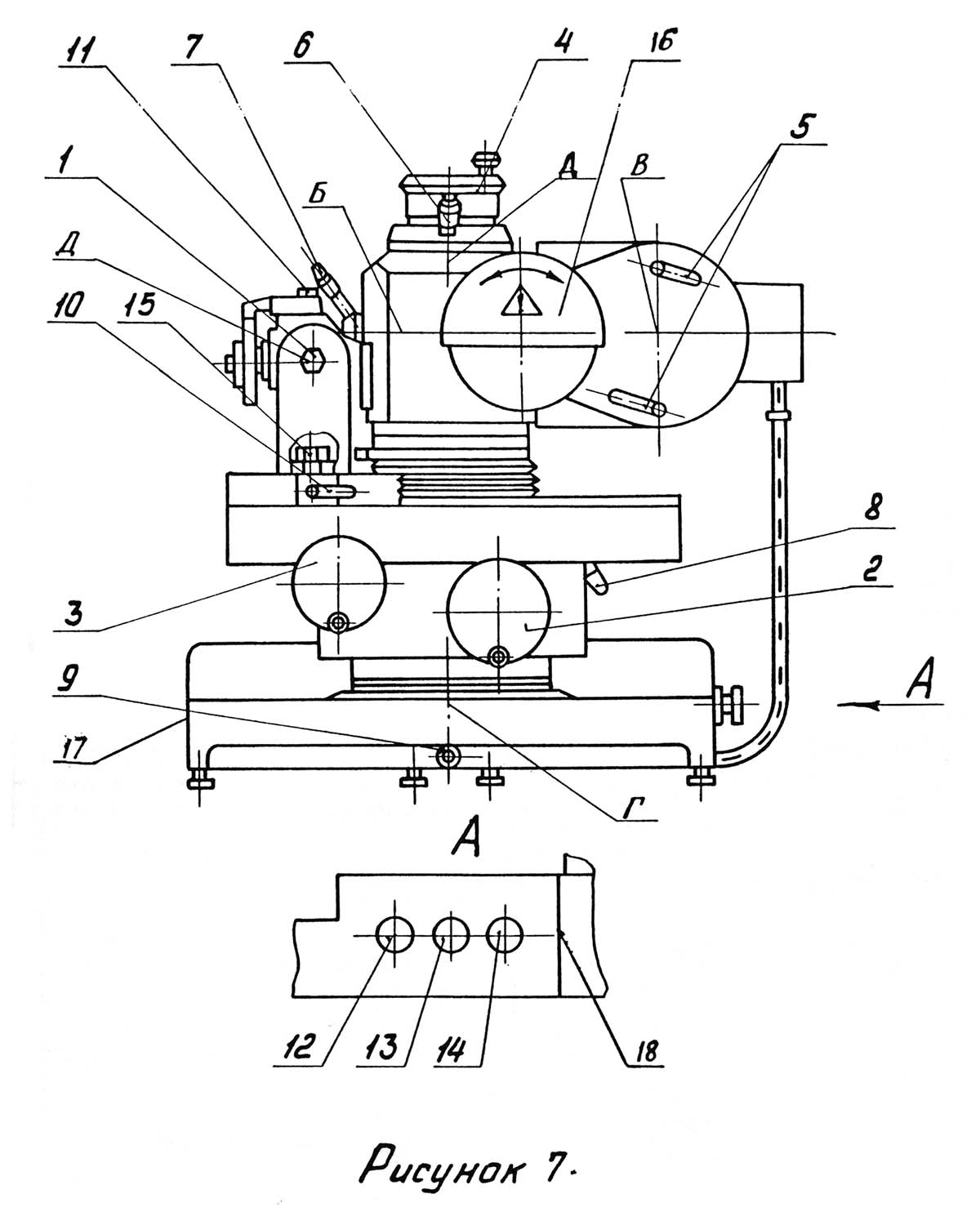 В состав пылевідведення входит сопло 1 з закрепленным на нем ниппелем 2. С помощью хомута 3, стержней 4 і 5, клеммы 6 і хомута 7 пылеотвод устанавливается на гильзе поворотного корпуса шлифовальной головки у кожуха шлифовального круга.