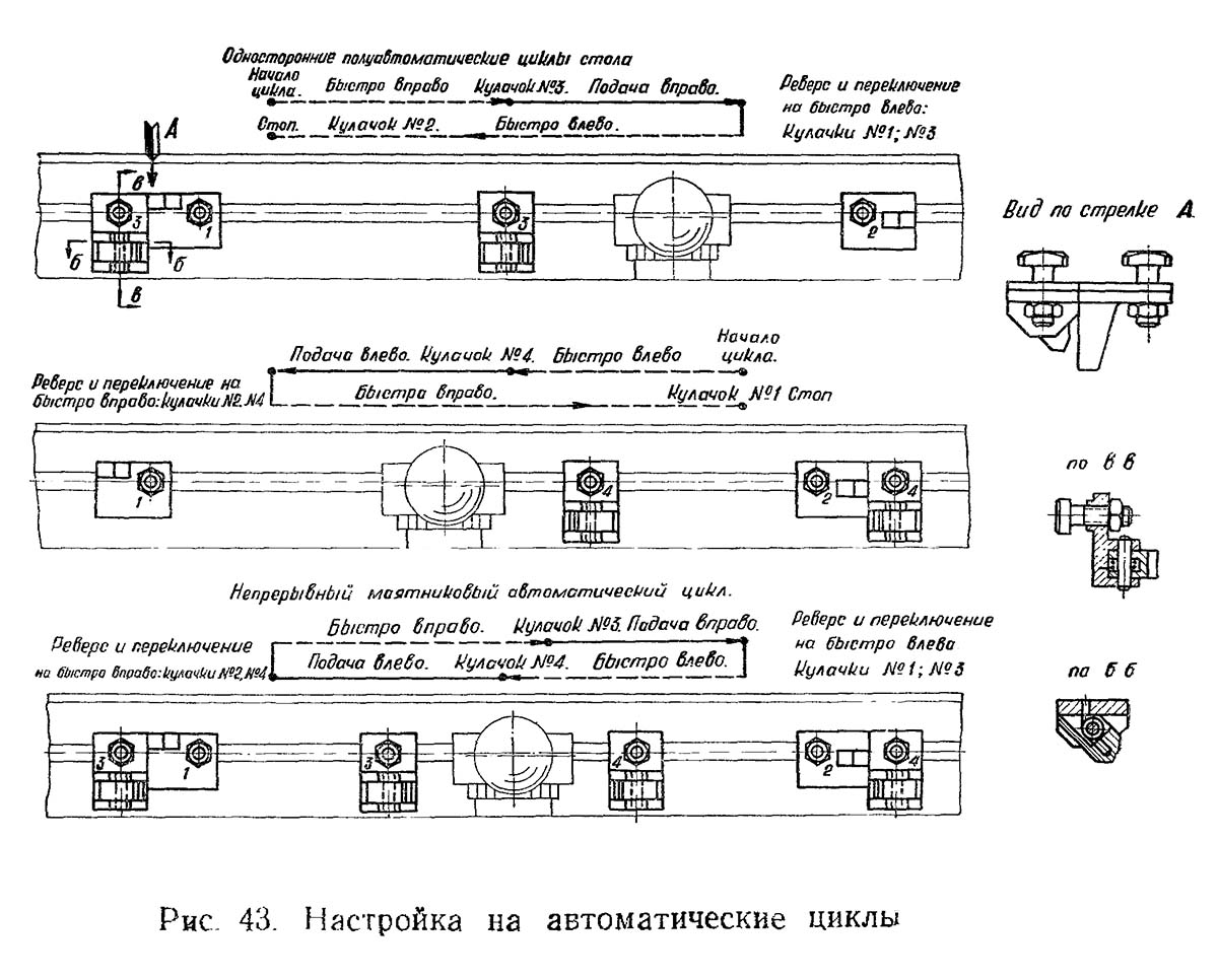 Расставляя в нужных местах паза стола кулачки, можно получать различные циклы движений: напівавтоматический вправо і влево (Ц1 і Ц2), автоматический маятниковый (Ц3) і др.