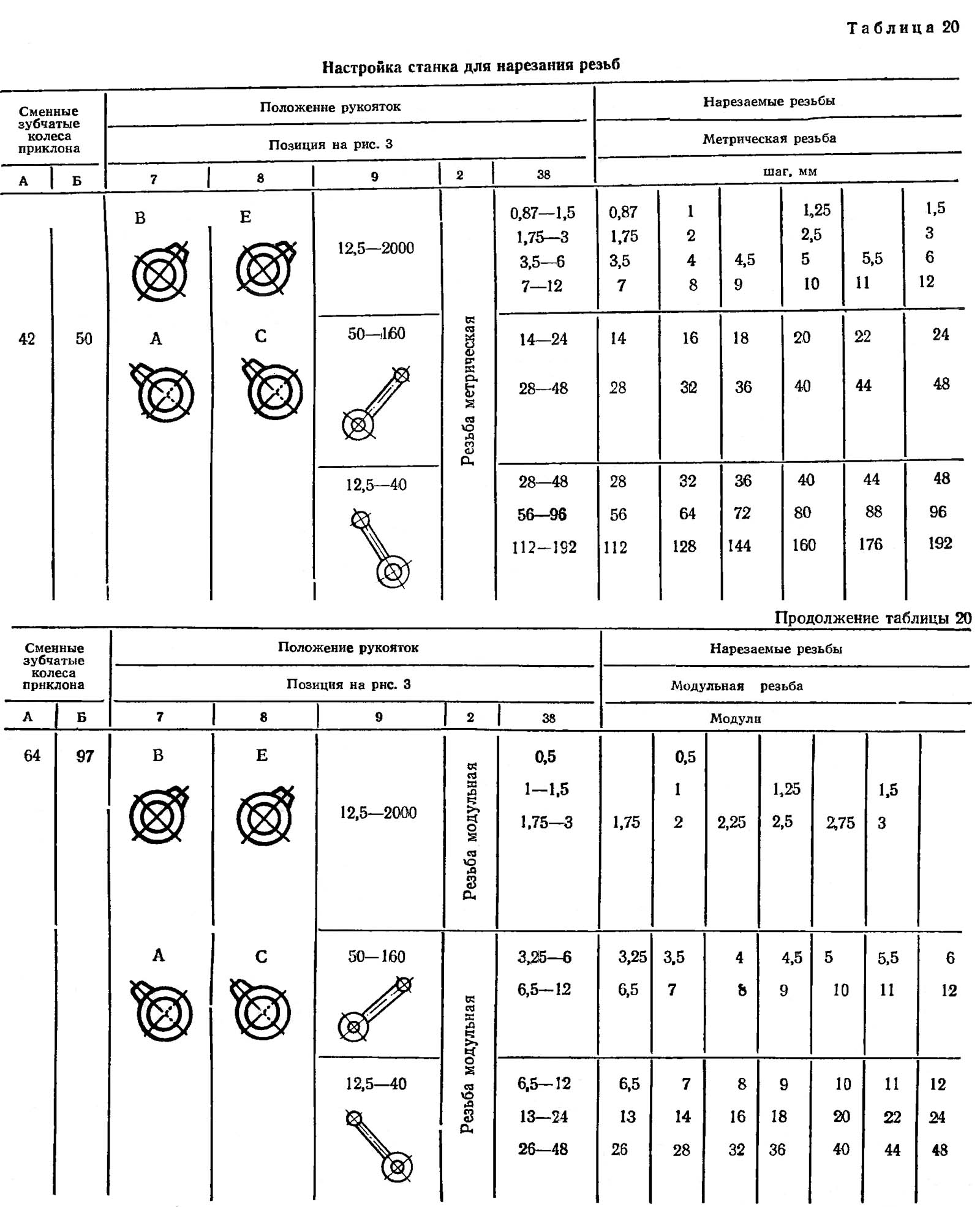 Дані для налаштування кроку різьби, що нарізається, наведені в таблиці 20.