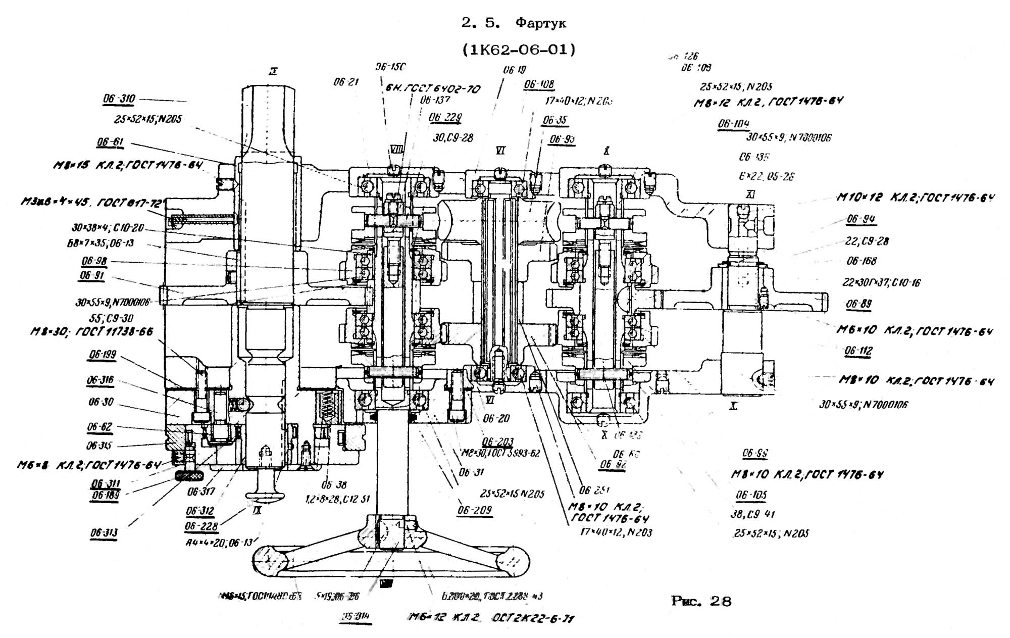 Рух від ходового валика передається через ковзну по ньому разом з фартухом шестерню z = 27 (див.схема1, 6) на черв'ячну передачу фартуха. З валу черв'ячного колеса обертання передається в залежності від того, яка із зубчастиних муфт М6, М7, М8 або М9 включена - або на рейкову шестерню г = 10 - для отримання поздовжньої подачі, або на шестерню г = 20, що сидить на гвинті, що подає XXI поперечних санок, - для отримання механічної поперечної подачі. Увімкнення всіх цих муфт на верстаті мод. 1К62 проводиться однією рукояткою (фіг. I, 16), причому напрямок включення збігається з напрямком подачі різця. Поздовжнє переміщення супорта вручну проводиться, за допомогою маховичка на валу XXII, коли ручка включення механічної подачі встановлена в середнє положення. У фартуху є пристрій, що унеможливлює включення подачі одночасно по ходовому гвинту і ходовому валику (блокування), так як таке включення призвело б до поломки.
