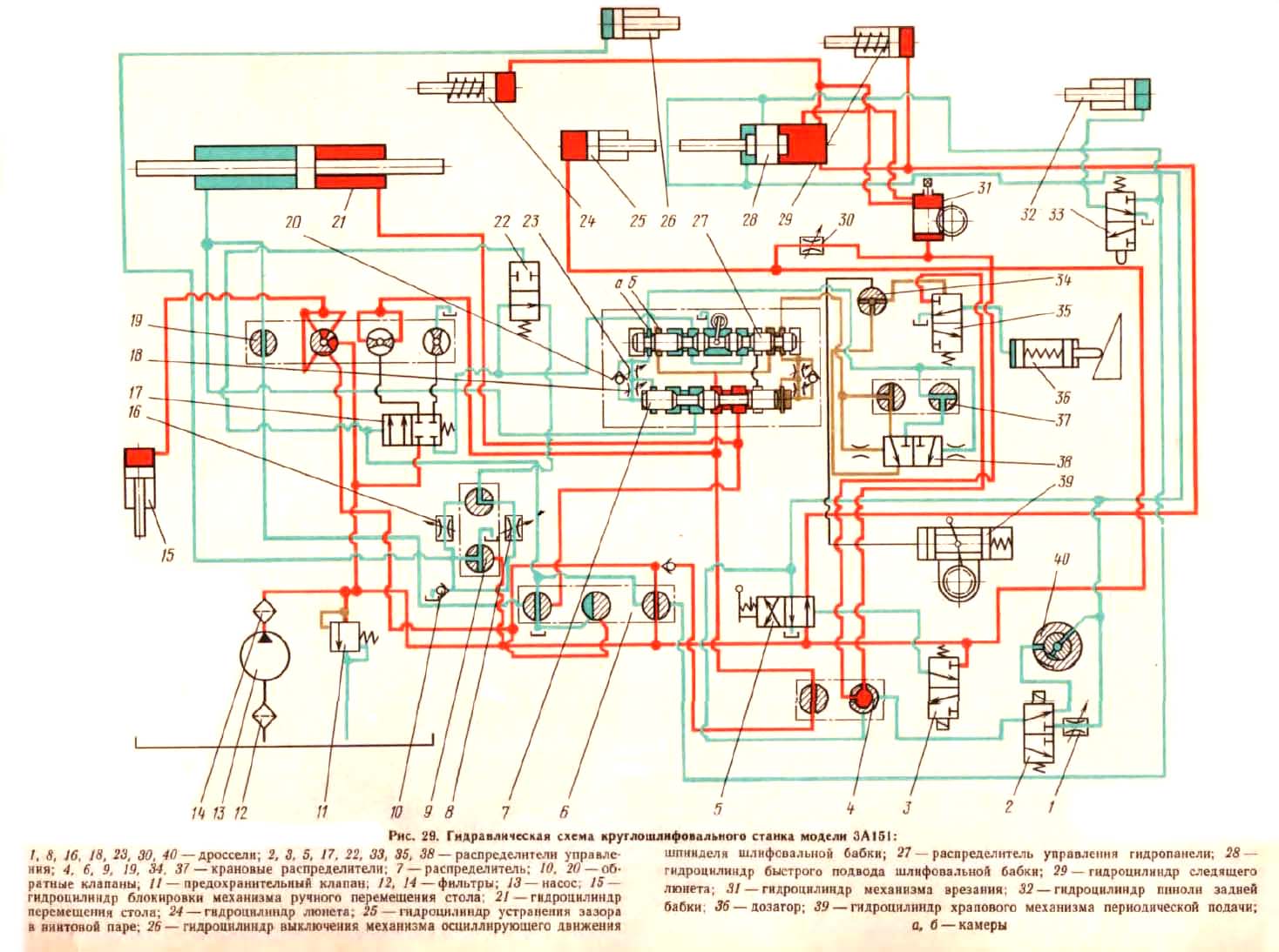 У гідропривід верстатів 3а151, 3а161 входять насос пластинчастого типу Н, гідроциліндри: переміщення столу ЦС, відведення пінолі ЦП, механізму блокування ЦБ, шліфувальної бабки ЦШБ, дозатора ЦД, вибірки люфтів (усунення зазорів) ЦВЛ, осциллуючого. Гідравлічна схема круглошліфувальних верстатів мод. 3а151 та 3а161 показана на рис. 55.