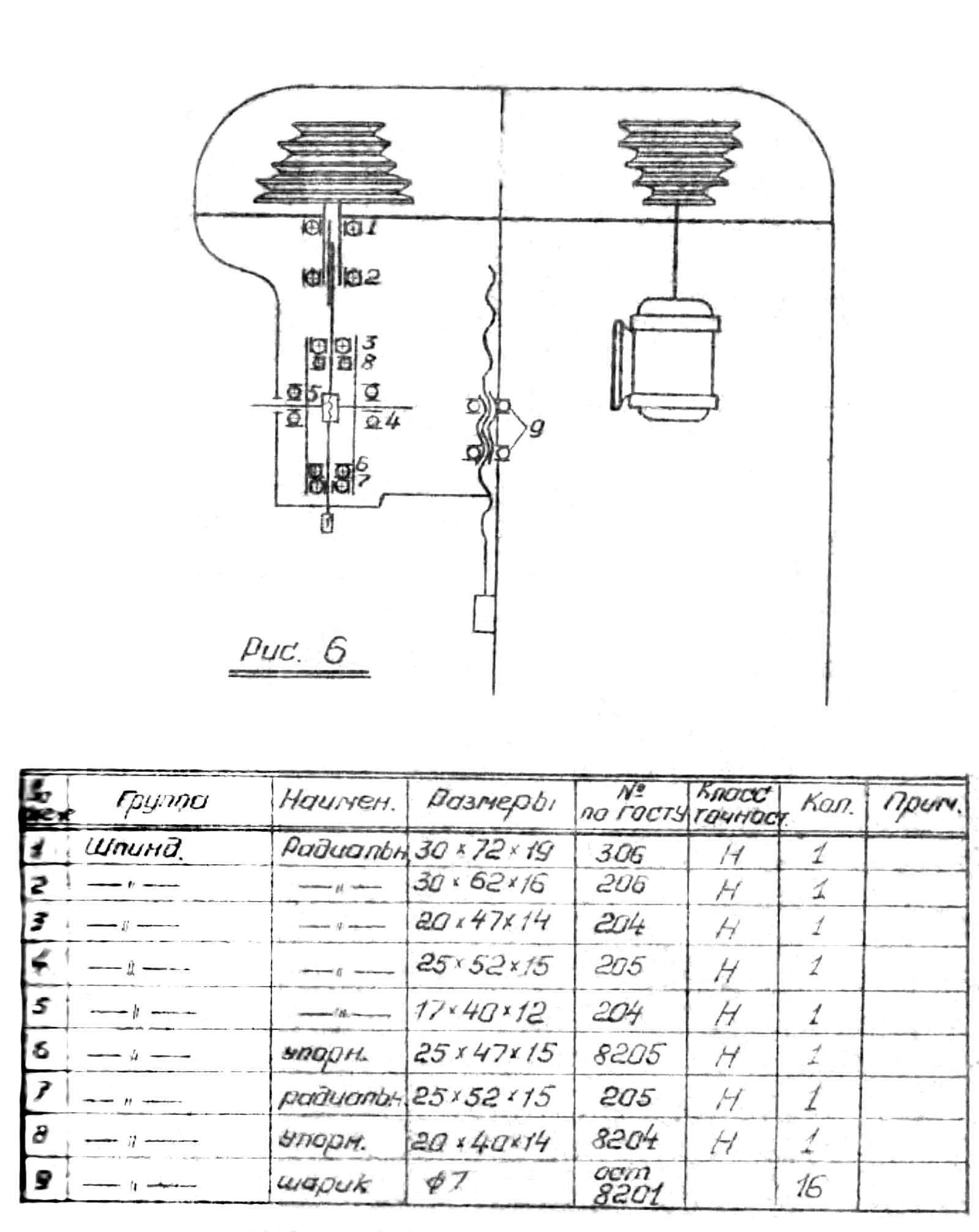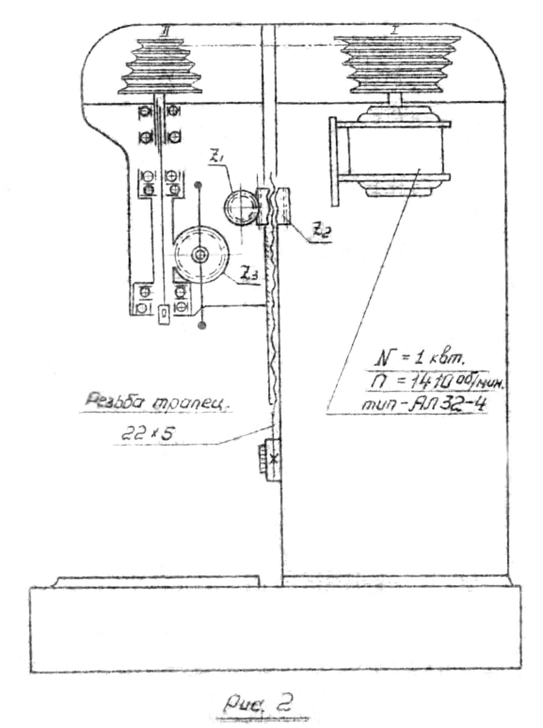 С помощью ступенчатых шкивов I і II і клинового ремня вращение от мотора передається втулке 9 і через скользящие шпонки 2 шпинделю 1.
