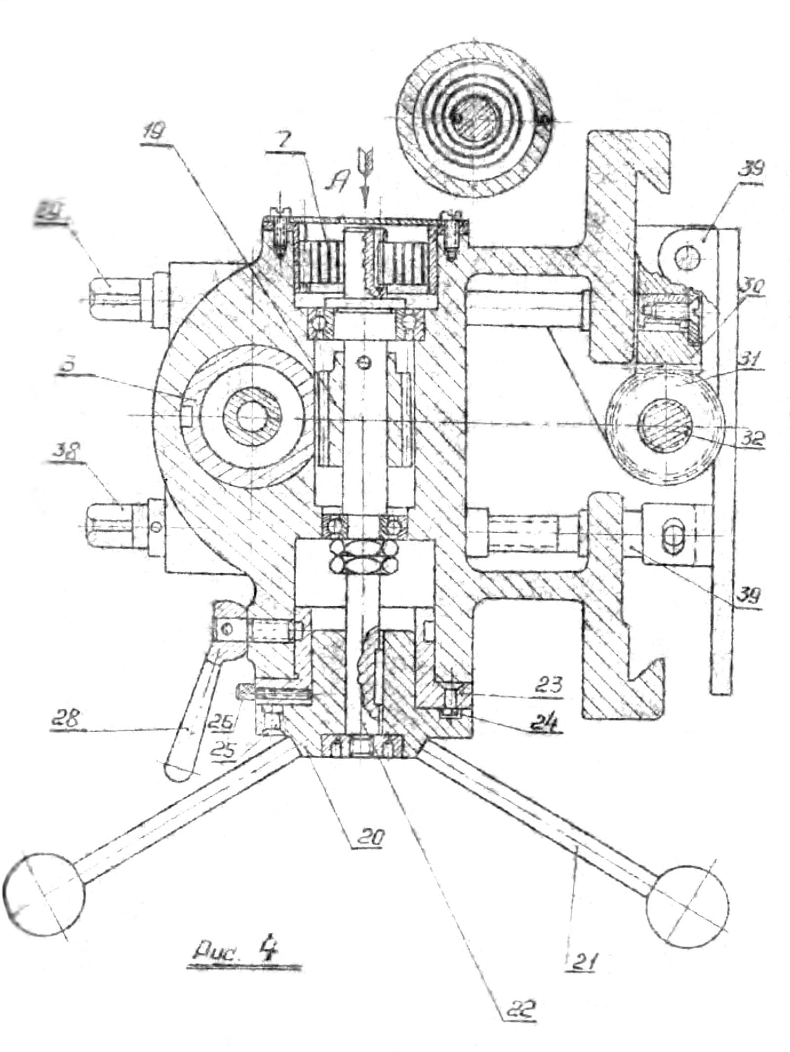 Штифт 26 служит для установки лимба на заданную глубину сверления; положение лимба фиксируется рукояткой 28.