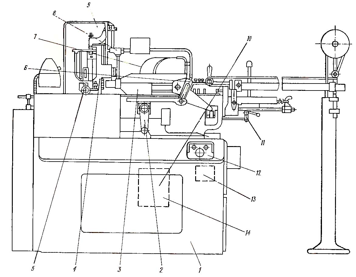 Шпиндель рухається від електродвигуна М, встановленого на кронштейні з рухомою плитою, розташованою позаду основи верстата.
