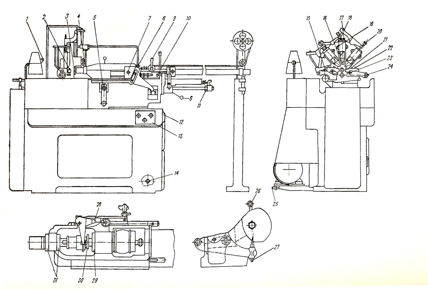 Вертикальні супорти 2, 3 та 5 розташовані на спеціальній стійці, мають прямолінійне переміщення та управляються від самостійних кулачків розподільчого валу. Два горизонтальні супорти 1 і 9 розташовані на балансирі 10, мають коливальний рух навколо осі 11 і управляються обидва від одного кулачка 12.