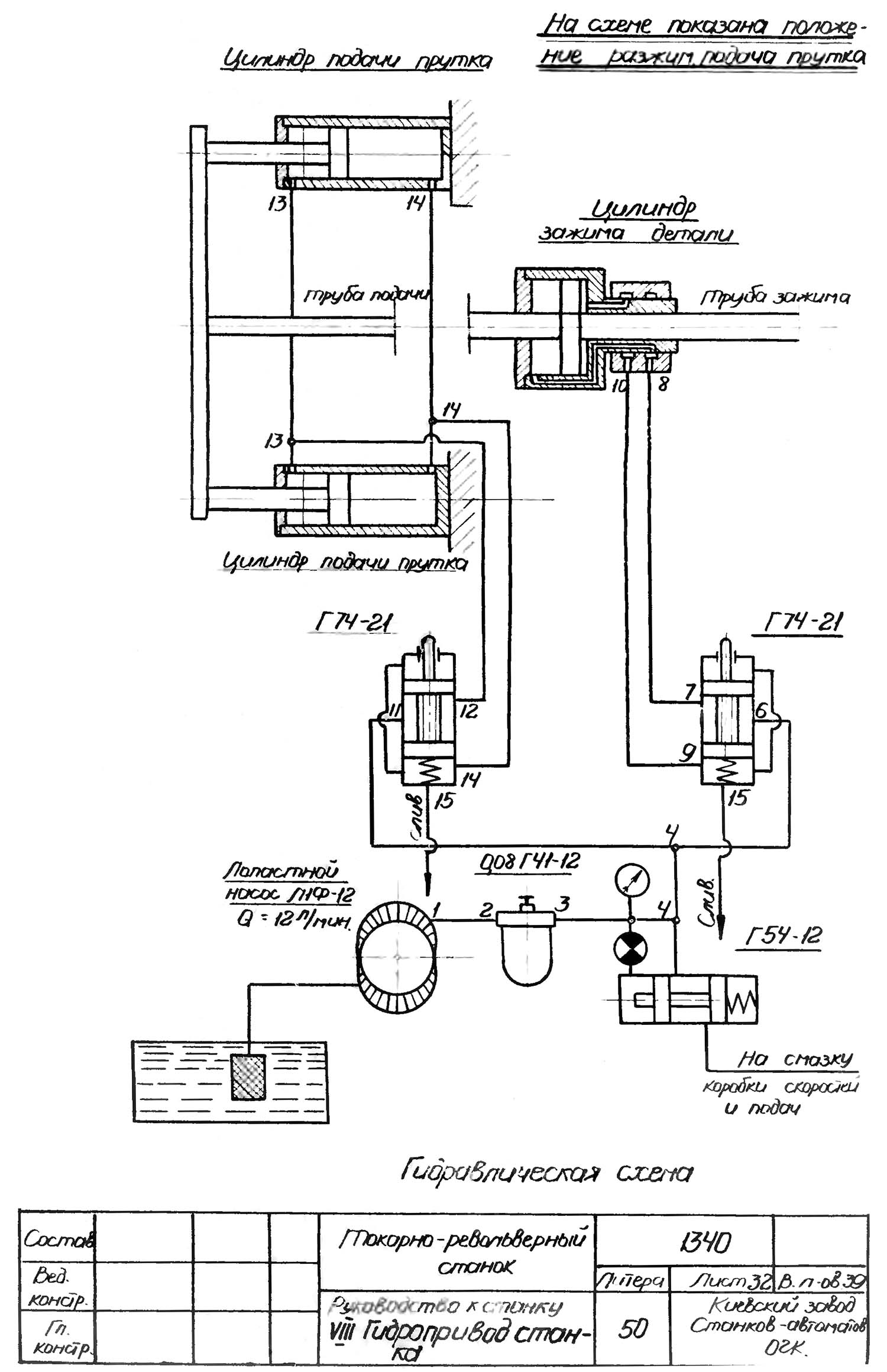 Гідравлічна схема токарно-револьверного верстата 1340. Дивитись у збільшеному масштабі