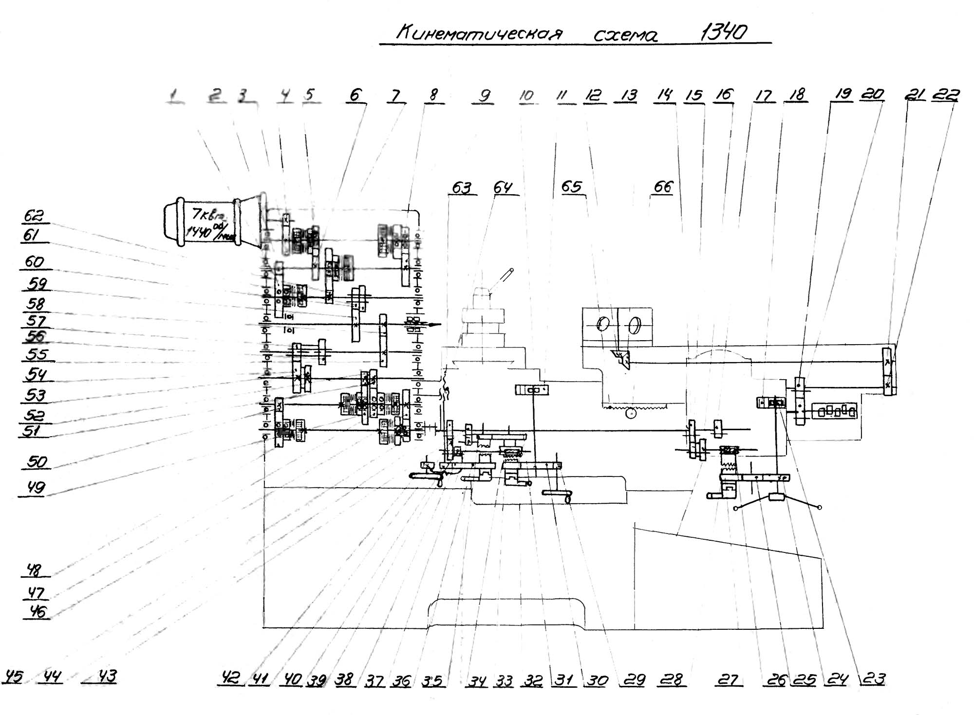 Схема кінематична токарно-револьверного верстата 1340. Дивитись у збільшеному масштабі