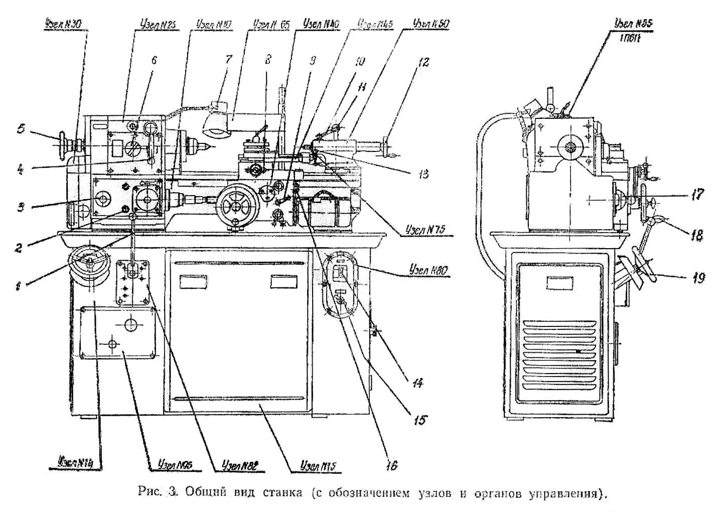Розташування вузлів та органів керування токарно-гвинторізним верстатом 1604