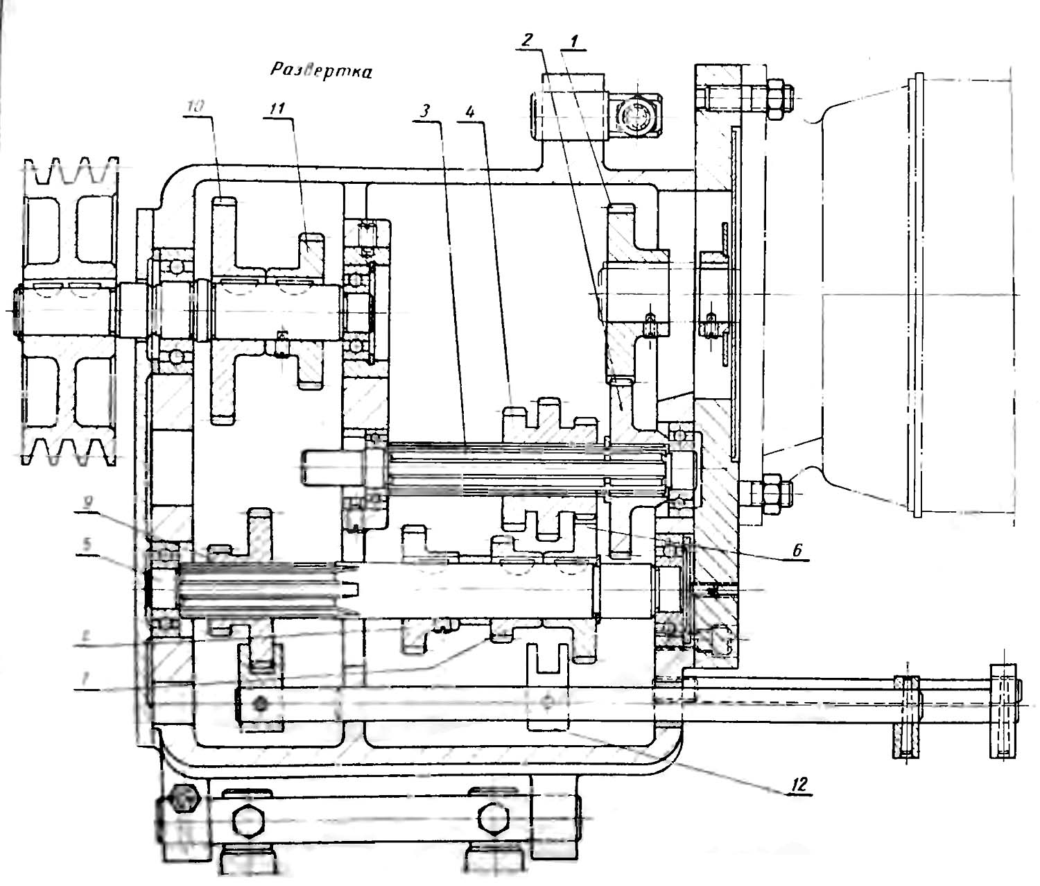 Каждой скорости редуктора соответствует свое расположение отверстий. Как уже указывалось выше, при повороте диска з барабаном происходит выбор нужной скорости, при етом против круглых реек 10 і 11 на диске располагается необходимая для данной скорости комбинация отверстий При перемещении переключающего диска в направлении стрелки б вдоль вала 6 он упирается в конец рейки 10 или 11 і перемещает ее. поворачивая при етом зацепляющуюся з нею шестерню 9. Одновременно з шестерней 9 получает вращение сидящая з ней на одной оси шестерня 7, вызывая перемещение рейки 3 з переключающей вилкой 4, Вилка входит в кольцевой паз блока шестерен 2 і при своем движении перемещает блок вдоль вала 1, производя переключение скорости.