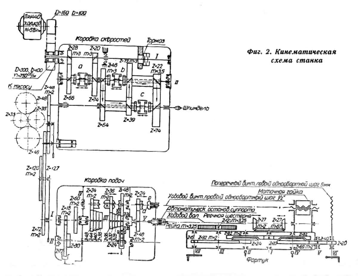Верстат приводится в рух индивидуальным електродвигуном, от которого вращение передається ремнем на шкив 8 коробки швидкостей. Шкив сидит жестко на валу I, на котором заклинены шестерни Z=28 і Z=20. С вала I вращение може быть передано валу II либо через шестерни Z=28 і Z=66, либо — Z=20 і Z=74. Шестерни Z=74 і Z=66 сидят на валу II вхолостую і могут быть сцеплены з валом зубчатой муфтой а, скользящей по шлицевому валу. На валу II сидят вхолостую шестерня Z=48 і двойной блок шестерен Z=73 і Z=22. Шестерни Z=48 і Z=73 зацепляются з двойным блоком Z=64, Z=39, а шестерня Z=22 з шестерней Z=74, сидящей на шпинделе вхолостую. При включении зубчатой муфты С влево вращение от вала II передається к шпинделю либо через передачу Z=48 і Z=64 включением муфты влево, либо через передачу Z=73, Z=39 включением муфты вправо. При включении муфты С вправо вращение от вала передається к шпинделю; при включении муфты влево — через передачу з числом зубьев 48·39·22 / 64·73·74 , муфта С должна быть включена вправо з шестерней Z=74.