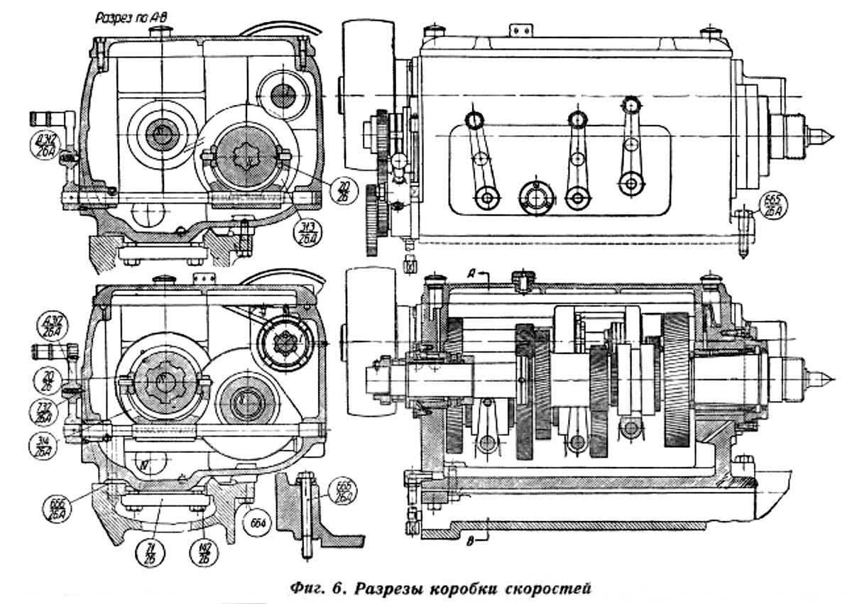 Коробка швидкостей (фиг. 5, 6 — см. вклейку). Приводной шкив Б503 сидит на шарикопідшипниках, на втулке А538, закрепленной в корпусе коробки швидкостей, отчего зусилля натяжения в ременной передаче воспринимаются втулкой і не передаются валу В518. Шкив связан з валом В518 фланцем Б529, сидящим на многошпоночном кінці вала. Вал В518 смонтирован на одном шариковом і двух конических роликовых підшипниках. Зазор в конических роликопідшипниках регулируется подтягиванием нарезанной втулки А511, законтриваемой гайкой 542.
