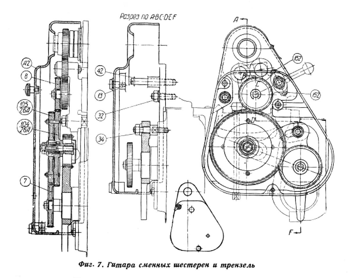 Трензель і гітара сменных шестерен (фиг. 7). Механізм трензеля (фиг. 7 і 5) состоит из шестерен Z=48, Z=36, Z=33, Z=48. Для изменения направления подачі корпус трензеля поворачивается вокруг втулки А16 і в требуемом положении закрепляется гайкой 110 (фиг. 5). Правильность сцепления шестерен, при переключении трензеля, регулируется установочними стопорами, которые ограничивают угол поворота корпуса.