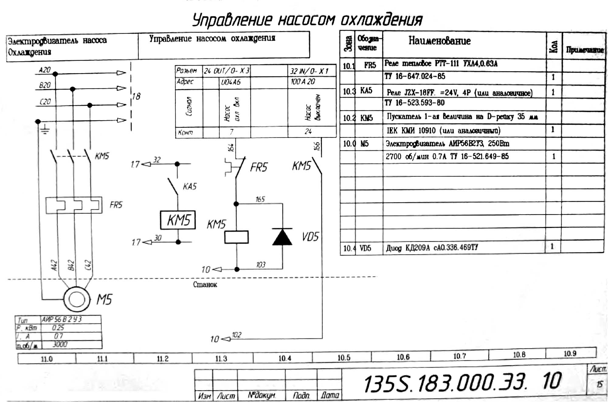 Увімкнення і вимкнення насоса охлаждения осуществляется от ПК посредством промежуточного реле КА5, включающего пускатель КМ5.