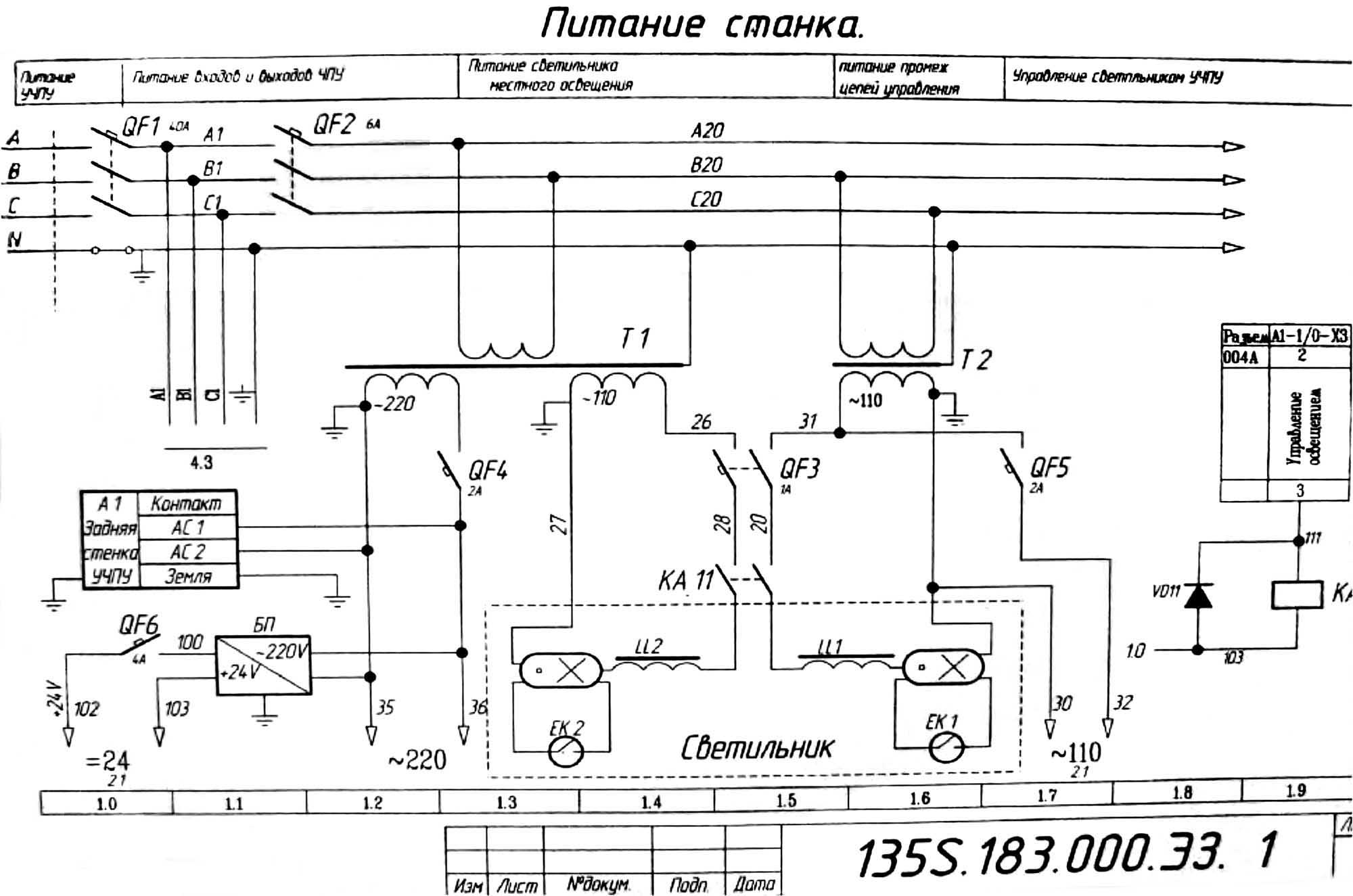 Схема електрична живлення і освещения токарного верстата 16Б16Т1