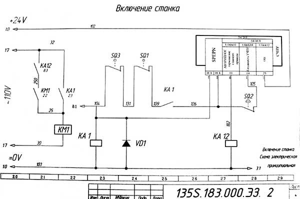 Кнопку F1 необходимо удерживать до тех пор пока не погаснет надпись «Нет готовности приводов». При етом будет подано питание на електроприводы і восстановится ланцюг живлення реле, подключенных ЧПУ. В ланцюг аварийного отключения входят: реле КА1, аварийные конечные выключатели координат SQ1 і SQ3 і аварийная кнопка SQ2. Питание ланцюги происходит от выхода УЧПУ (при готовности). При включении верстата замыка-ется внутреннее реле SPEPN і реле КА1 встает на самопитание через ланцюг аварийного отключения, після чего верстат готов к работе.